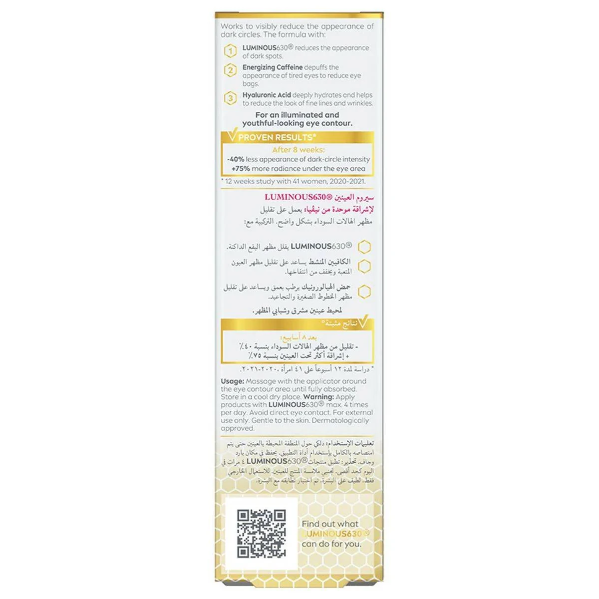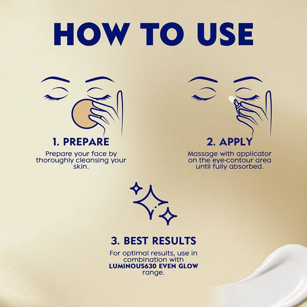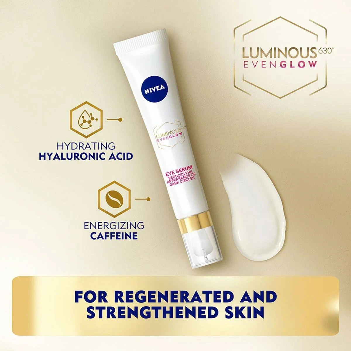 Nivea Luminous 630 Even Glow Eye Serum reduces dark circles and eye bags with LUMINOUS630, caffeine, and hyaluronic acid. Suitable for all skin types, including sensitive skin. Features Reduces appearance of dark circles Hydrating hyaluronic acid Energizing caffeine Suitable for all skin types Illuminates and provides a youthful-looking eye contour Patented LUMINOUS630 technology Depuffs tired eyes and reduces eye bags Reduces fine lines and wrinkles