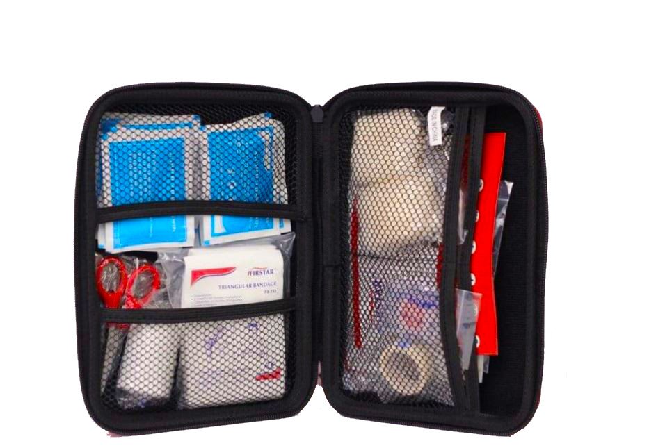 شنطة الإسعافات الأولية مجهزة بمعدات عالية الجودة توفر الشنطة باللون الأبيض العاكس للأشعة مما يحفظ المعدات من درجات الحرارة .