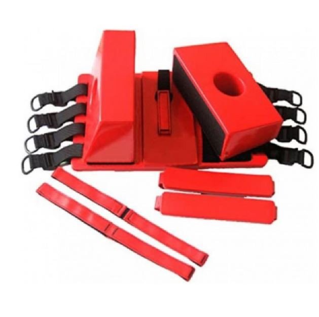 مثبت رأس مزود بأحزمة يتم تثبيتها أعلى وأسفل رأس المصاب لمنع الحركة. مثبت رأس مزود بأحزمة إضافية لربطه بالنقالة وتوفير ثبات أكبر لمثبت الرأس فتحات على جانبي رأس المصاب تساعد المُسعف على معاينة رأس المصاب وقياس درجة حرارته بسهولة.