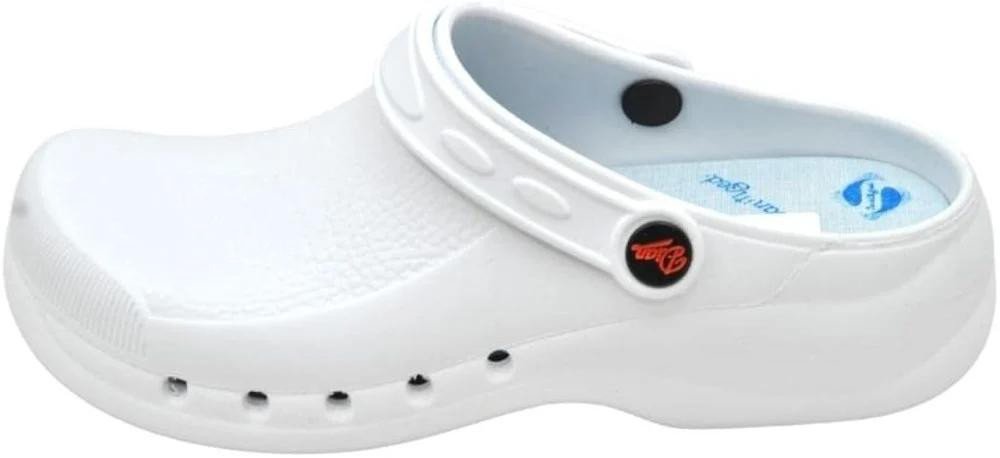 Lightweight, antibacterial EVA clogs with non-slip ridges on the sole, single-sleeved, anatomical, and non-slip. Machine washable up to 40°C. With a back strap between the heel and the toe, perforated on the sides for easy ventilation and cleaning, and preventing direct penetration of clogs. Sowed with massage nubs to stimulate blood circulation. With a fabric sole on latex foam, antibacterial treatment.