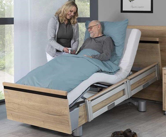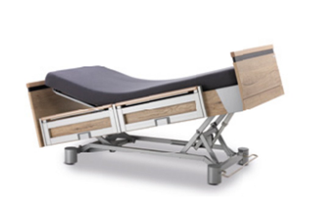 Malsch premium healtcare bed AURA 120 x 200 cm Full electric 4-motor low entry bed with universal properties for fall prevention, mobilization and inpatient care. Absolutely homely character, optimum functionality and max.