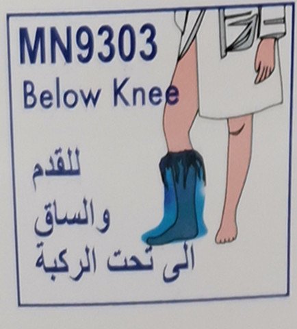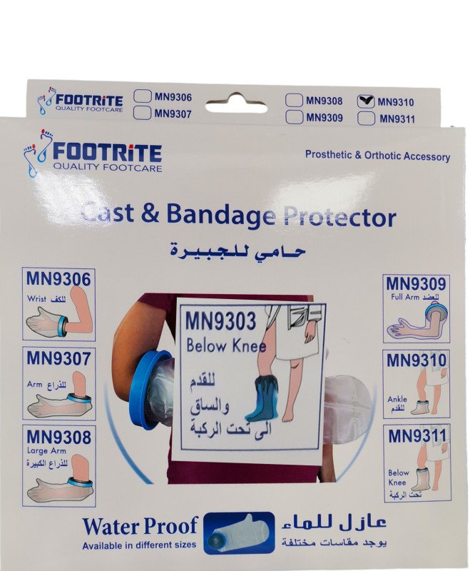 حامي الجبيرة للقدم والكاحل يتكون من غلاف بلاستيكي طويل محكم الاغلاق في احد الاطراف وقابل للتعديل بشريط مطاطي أو شريط لاصق أو أربطة على الطرف الأخر . يحمي الجبيره من الماء اثناء الاستحمام.
