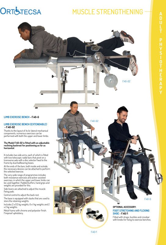 • Limb Exercise Bench – F.40-G • Limb Exercise Bench (Extendable) – F.40-G2 • Its dual mechanical design allows for many exercises to be performed with both the upper and lower limbs. • The F.40-G2 is equipped with a backrest that can be adjusted to be positioned horizontally. • It includes two side arms, each with two telescopic radial rods that rotate on a transverse axis with a disc limiter fixed to the frame by two ball boxes. • At the ends of the rods, both inside and outside, the necessary equipment for performing the specific exercise can be attached. • The very wide range of programs includes resistance exercises and exercises with active assistance, where the upper and lower limbs can be used together. Padded storage, hand grips and weights are provided for this purpose. • Side levers are attached to adjust the muscle stabilizing pads. • Central control to adjust the backrest. • The base is equipped with stacks used to store weights. • Chrome-plated metal frame and polyester. Fire-resistant upholstery. • Made in Spain.
