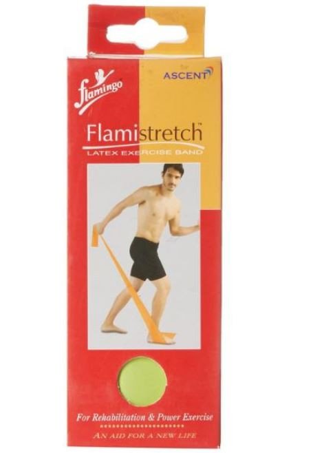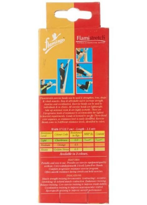 Flamingo Latex Stretch Fitness Exercise Band is used for muscle strength training, also used for muscle rehabilitation after injury, Easy and affordable aid to increase strength, endurance and coordination, Can be used by individuals and in clinics, Lightweight, compact and portable, Available in three different colors and resistance strength, Made of natural latex rubber.