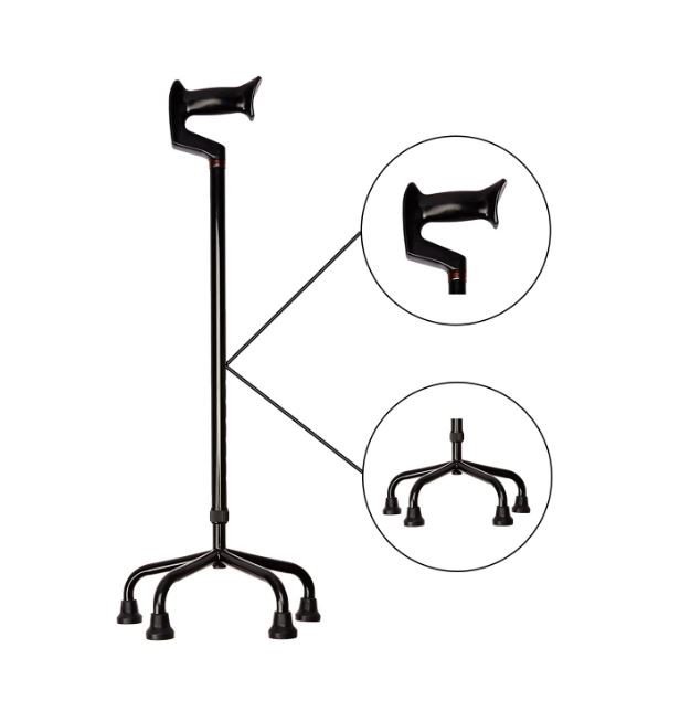 Quad stand with low base provides better balance and support while walking Unique handle design for comfortable grip and bi-directional use Provides good stability with maximum comfort.
