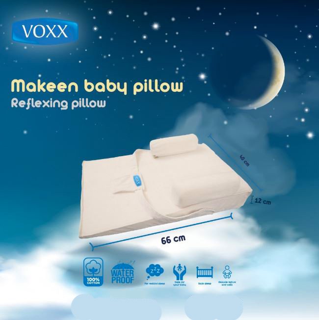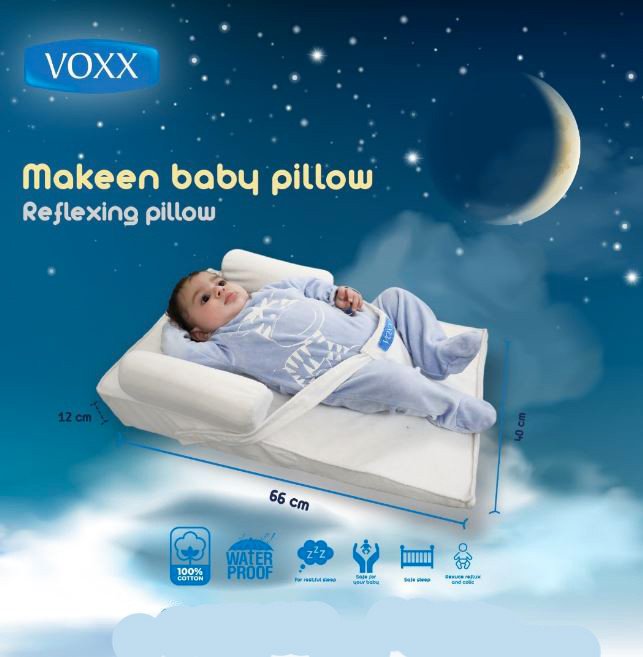 Large slanted baby reflux pillow with a height of 8 to 12 cm and a width of 66 x 40 cm. Small. Doctors recommend that babies sleep, especially those who suffer from the problem of reflux. Sleeping the baby at an angle greatly reduces the problem of milk reflux and stomach pain (colic) and ensures the baby a peaceful sleep without being exposed to frequent waking up. The degree of inclination of the pillows is scientifically studied to suit the baby from newborn to one year old. Senior pediatricians were consulted to provide the pillows with the desired purpose. VOXX Company used 100% cotton fabric for all pillows. The pillow does not cause allergies to the baby. Most importantly, the fabric is equipped with an inner layer of tarpaulin to prevent any leakage of the inner sponge. The pillow is equipped with a zipper to easily remove the inner foam in order to wash the cover.