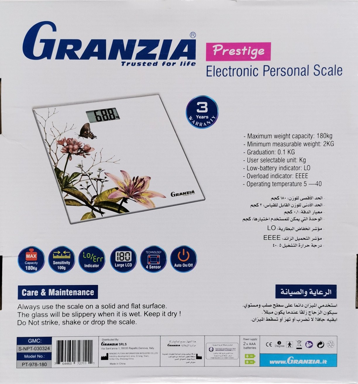 ميزان إلكتروني شخصي بتكنولوجيا دقة الاستشعار يزن إلى 180 كجم تصميم عملي خفيف الوزن ومصنوع من مواد بلاستيكية عالية الجودة أربعة مستشعرات تعمل تلقائياً عند الوقوف على الميزان لدقة في الوزن.