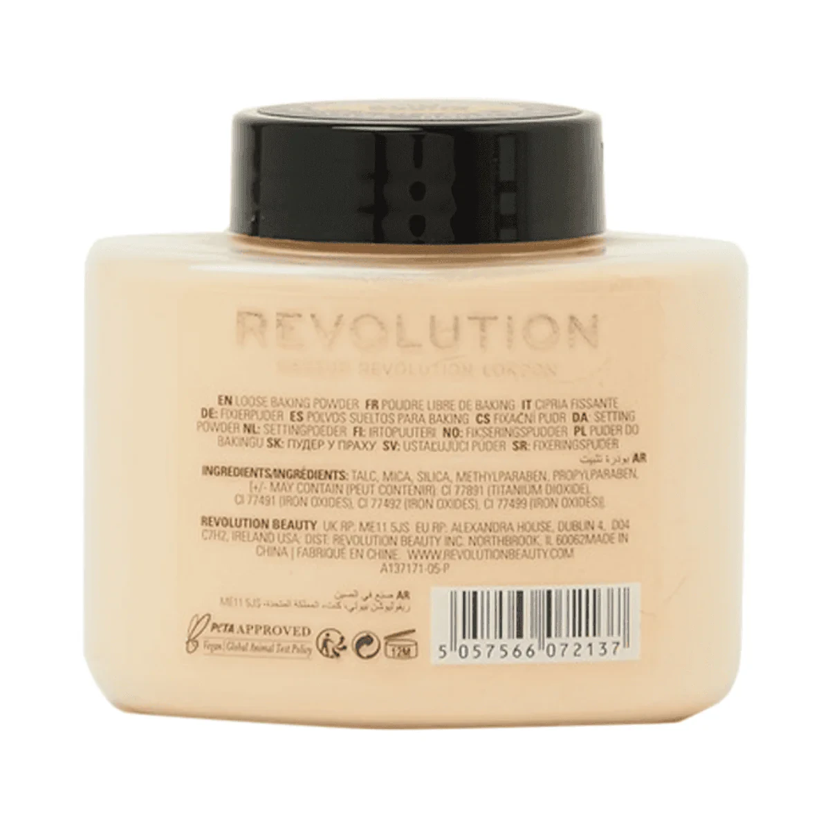 Revolution Makeup Loose Baking Powder Banana is designed to set makeup and reduce shine. Ideal for all skin tones, it provides a smooth, matte finish. Perfect for baking and highlighting. Key Features Loose baking powder Banana shade Matte finish Lightweight formula Suitable for all skin tones Talc, Mica, Silica, Methylparaben, Propylparaben. May Contain: Ci 77891 (Titanium Dioxide), Ci 77491 (Iron Oxides), Ci 77492 (Iron Oxides), Ci 77499 (Iron Oxides).Revolution Beauty: Innovators in affordable, high-quality cosmetics.Dip a brush or damp sponge into powder. Press onto areas needing setting (e.g., under eyes, T-zone). Let sit for a few minutes (bake), then sweep away excess.For external use only. Avoid inhalation (dust). If irritation occurs, discontinue use.