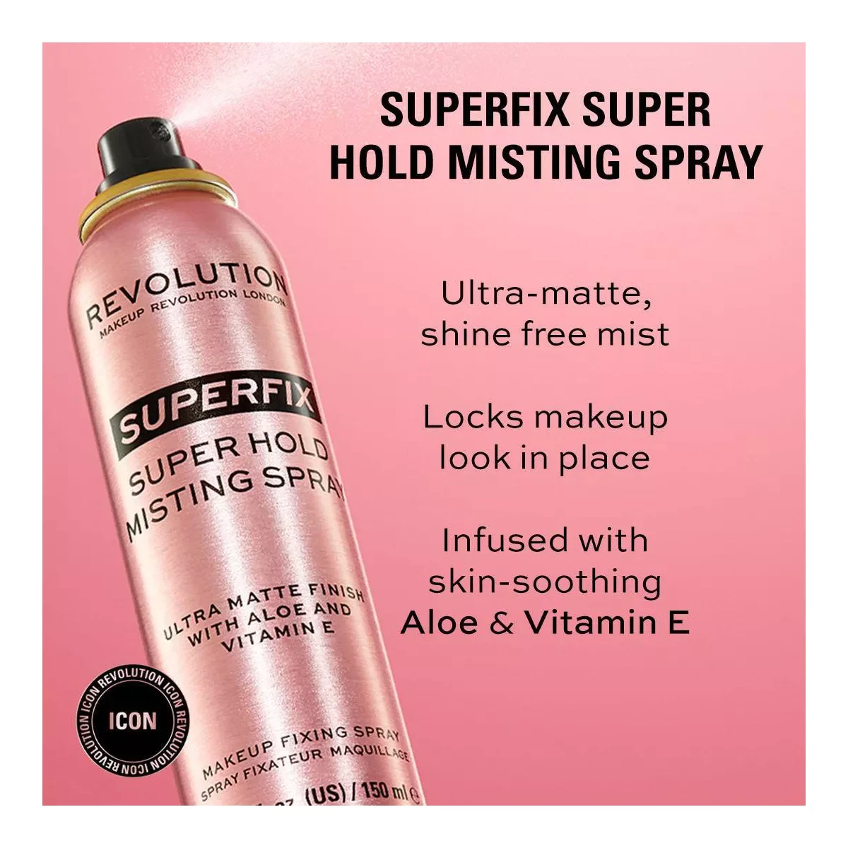 Revolution Makeup Superfix Misting Spray is a long-lasting, ultra-matte fixing mist that locks your makeup in place for up to 16 hours. Infused with Aloe Vera and Vitamin E, it provides a shine-free finish while soothing the skin. Ideal for all-day wear, it is smudge-proof and transfer-resistant. Key Features Ultra matte finish   Aloe Vera, Vitamin ERevolution Beauty: Innovators in makeup and skincare, known for trend-led products and inclusive beauty solutions.Hold The Bottle At Arm'S Length And Spray Evenly Over Your Face After Makeup Application.For external use only. Avoid contact with eyes. Discontinue use if irritation occurs.