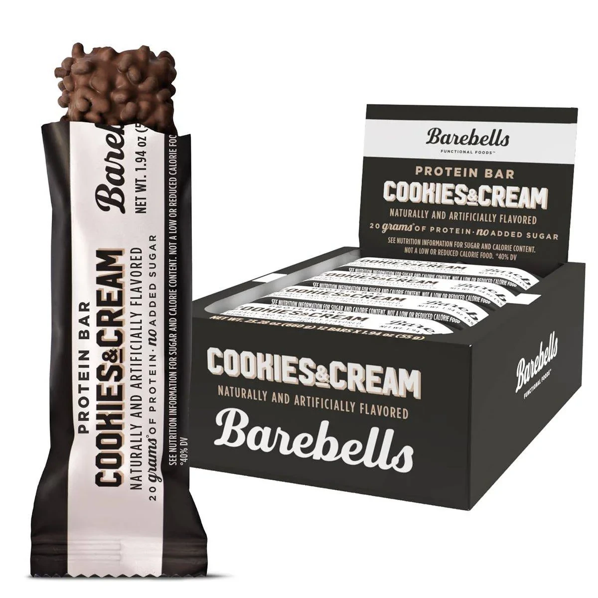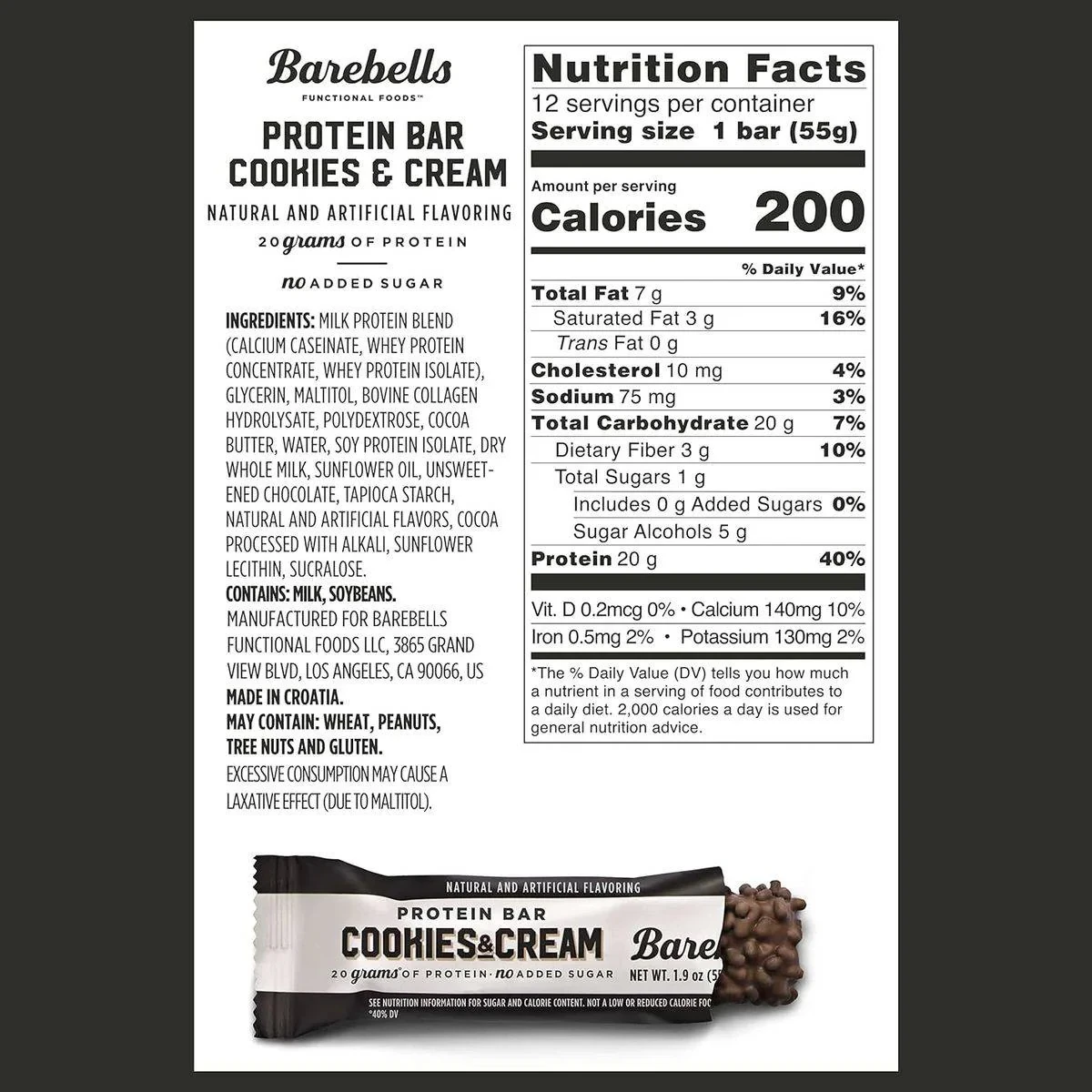 Barebells Cookies & Cream Protein Bar offers 20 grams of protein with no added sugar, perfect for post-workout recovery or a healthy snack anytime. Features 20 grams of protein per bar No added sugar Ideal for fitness enthusiasts Delicious cookies and cream flavor Supports muscle building and recovery Provides sustained energy Milk Protein Blend (Calcium Caseinate, Whey Protein Concentrate, Whey Protein Isolate), Glycerin, Maltitol, Bovine Collagen Hydrolysate, Polydextrose, Cocoa Butter, Water, Soy Protein Isolate, Dry Whole Milk, Sunflower Oil, Unsweetened Chocolate, Tapioca Starch, Natural and Artificial Flavors, Cocoa Processed with Alkali, Sunflower Lecithin, Sucralose.Barebells: Known for delicious protein bars with no added sugar.Consume one bar after workout or as a snackContains milk and soybeans. May contain wheat, peanuts, tree nuts, and gluten. Excessive consumption may cause a laxative effect (due to maltitol).