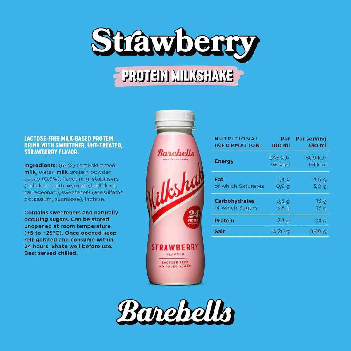 Barebells Protein Milkshake Strawberry is a lactose-free, milk-based protein drink with sweetener and UHT-treated strawberry flavor. Contains 24g of protein per serving, ideal for active individuals seeking a tasty and nutritious option. Key Features Lactose-free milk-based protein drink UHT-treated strawberry flavor No added sugar 24g protein per serving Milk, Water, Milk Protein Powder, Cacao (0.9%), Flavouring, Stabilisers (Cellulose, Carboxymethylcellulose, Carrageenan), Sweeteners (Acesulfame Potassium, Sucralose), Lactase.Barebells offers delicious protein-enriched snacks and shakes, perfect for active lifestyles.Shake well before use.Contains sweeteners and naturally occurring sugars.