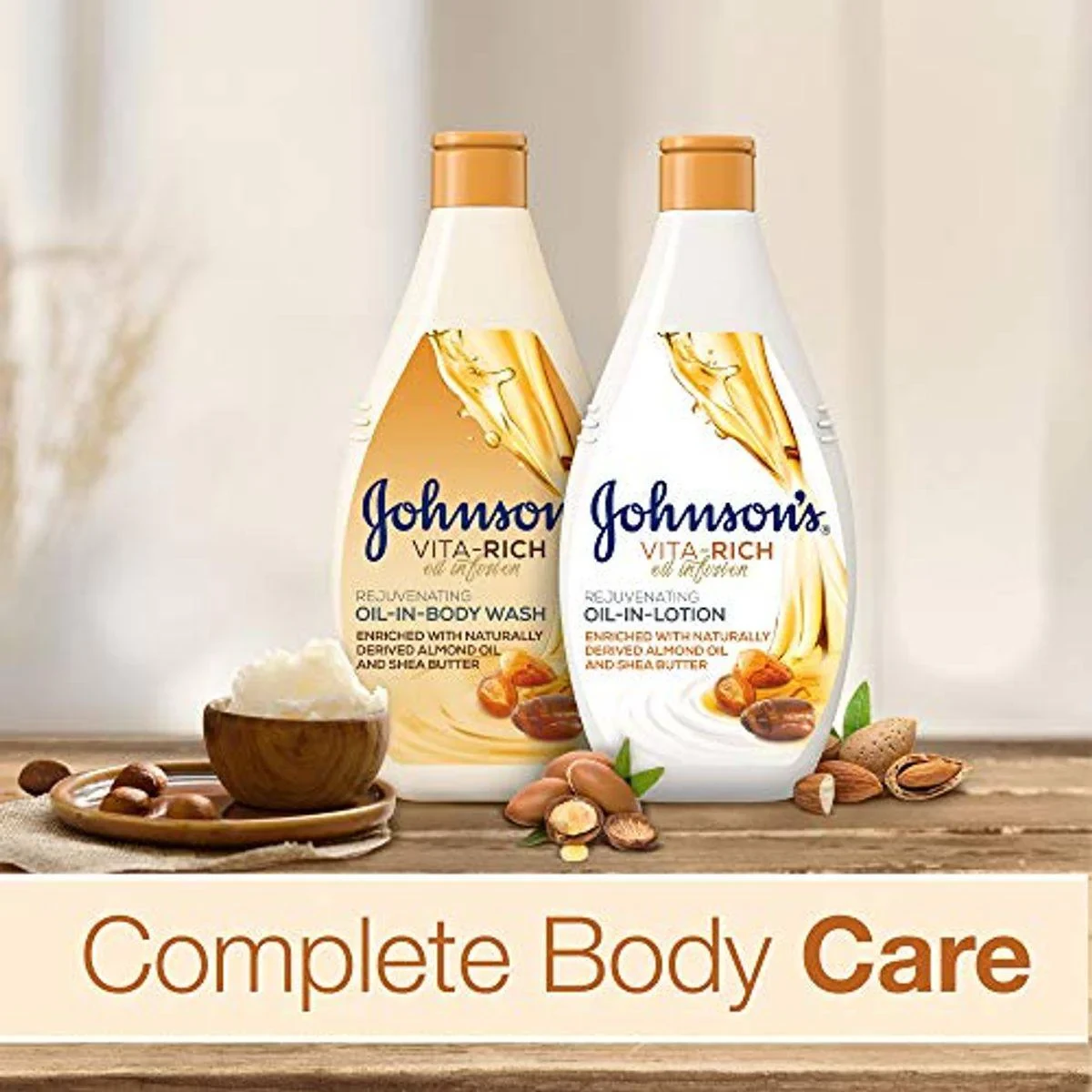 This non-greasy, fast-absorbing body lotion is enriched with almond oil, argan oil, and shea butter. It provides 48-hour hydration, leaving skin radiant and velvety soft. Key Features 48-hour nourishment Non-greasy formula Fast-absorbing Enriched with almond oil, argan oil, and shea butter Infused with rejuvenating fragrance Leaves skin radiant and velvety soft Aqua, Paraffinum Liquidum, Glycerin, Butyrospermum Parkii Butter, Prunus Amygdalus Dulcis Oil, Argania Spinosa Kernel Oil, Hydrogenated Palm Glycerides, Caprylyl Glycol, Carbomer, Potassium Cetyl Phosphate, P-Anisic Acid, Sodium Hydroxide, Phenoxyethanol, Parfum.Experts in skincare, offering gentle and nourishing products for soft and velvety skin.Apply Johnson'S Vita-Rich Rejuvenating Oil-In-Lotion After Shower Or Bath.For external use only. Discontinue use if irritation occurs.