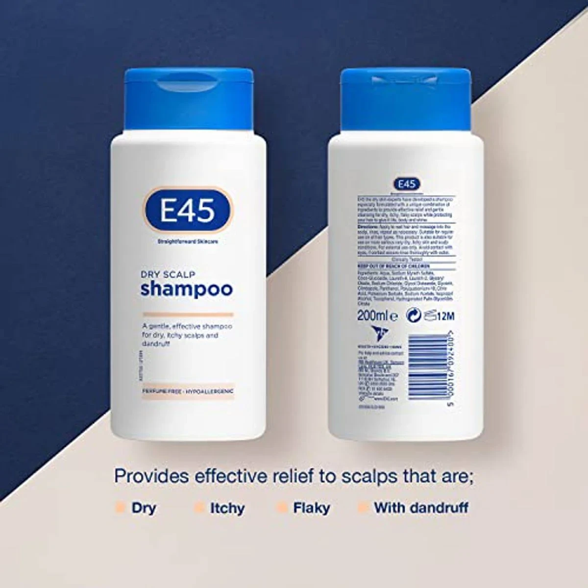 /ul Aqua, Sodium Myreth Sulfate, Coco-Glucoside, Laureth-6, Laureth-2, Glyceryl Oleate, Sodium Chloride, Glycol Distearate, Glycerin, Climbazole, Panthenol, Polyquaternium-10, Citric Acid, Potassium Sorbate, Sodium Acetate, Isopropyl Alcohol, Tocopherol, Hydrogenated Vegetable Glycerides Citrate.E45 is renowned for its dermatological skincare solutions, specializing in gentle, fragrance-free products for sensitive skin.Wet hair, apply shampoo to scalp, gently massage, leave on briefly, rinse thoroughly.Avoid contact with eyes; if contact occurs, rinse thoroughly with water.