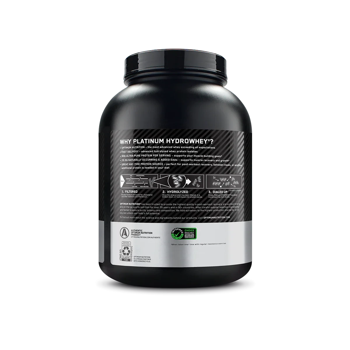Platinum Hydrowhey® is the most advanced whey protein we've ever developed. In a word: Excellence. By hydrolyzing whey protein isolates to break larger proteins down into smaller pieces, these ultra-pure whey isolates are able to get into your system rapidly, enabling your muscles to start recovering from heavy training. We've dialed up this ultra pure and rapidly-digesting formula with added micronized Branched Chain Amino Acids (BCAAs). Hydrolyzed Whey Protein Isolates, Micronized Branched Chain Amino Acids (L-Leucine, L-Isoleucine, L-Valine), Natural and Artificial Flavors, Lecithin, Contains 1.5% or Less of: Creamer (Sunflower Oil, Maltodextrin, Modified Food Starch, Dipotassium Phosphate, Tricalcium Phosphate, Tocopherols), Salt, Cellulose Gum, Vanillin, Acesulfame Potassium, Sucralose, Enzyme Blend (Aminogen, Maltodextrin, Amylase, Protease, Cellulase, Beta-D-Galactosidase, Lipase)Platinum Hydrowhey® is the most advanced whey protein we've ever developed. In a word: Excellence. By hydrolyzing whey protein isolates to break larger proteins down into smaller pieces, these ultra-pure whey isolates are able to get into your system rapidly, enabling your muscles to start recovering from heavy training. We've dialed up this ultra pure and rapidly-digesting formula with added micronized Branched Chain Amino Acids (BCAAs).Platinum HYDROWHEY® is INSTANTIZED, so it mixes up completely and easily. Add 1 scoop of Platinum Hydrowhey® to a blender, shaker cup, or glass filled with 10-12 fl oz of cold water, milk, or juice and blend, shake, or stir for 20-30 seconds or until powder is dissolved. TIP: Use faster-acting Platinum HYDROWHEY during the day and more slow-digesting GOLD STANDARD 100% CASEIN at night or in between meals for around the clock amino coverage.Do not use as sole source of nutrition. Keep out of reach of children. ALLERGEN INFORMATION: Contains Milk And Soy (Lecithin) Ingredients.This product is labelled to United States standards and may differ from similar products sold elsewhere in its ingredients, labeling and allergen warnings