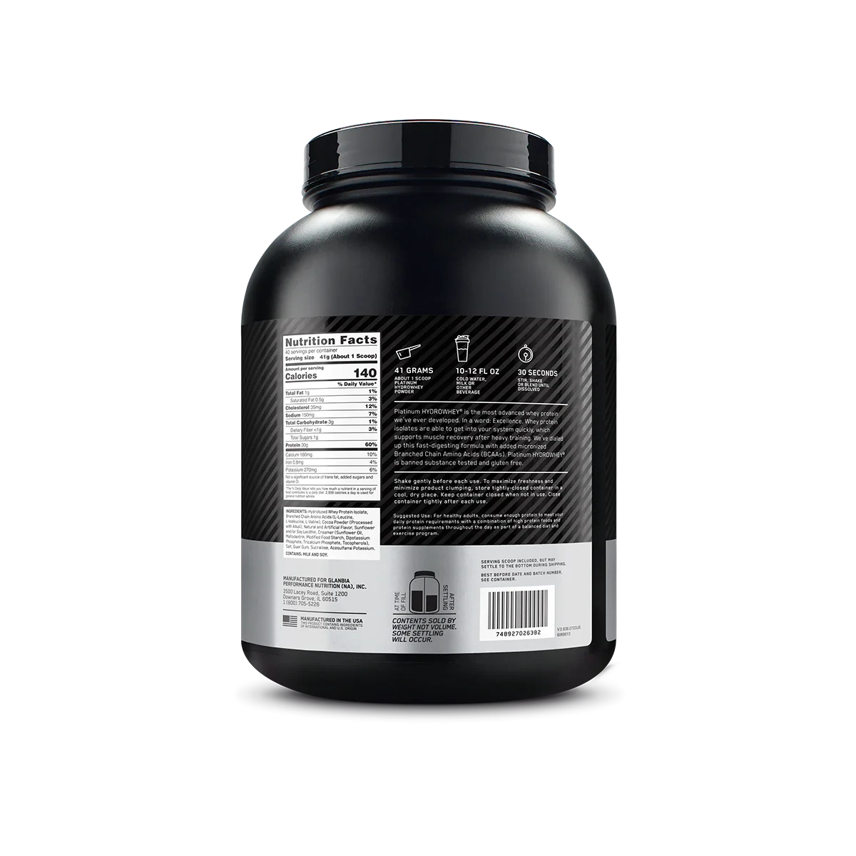 Platinum Hydrowhey® is the most advanced whey protein we've ever developed. In a word: Excellence. By hydrolyzing whey protein isolates to break larger proteins down into smaller pieces, these ultra-pure whey isolates are able to get into your system rapidly, enabling your muscles to start recovering from heavy training. We've dialed up this ultra pure and rapidly-digesting formula with added micronized Branched Chain Amino Acids (BCAAs). Hydrolyzed Whey Protein Isolates, Micronized Branched Chain Amino Acids (L-Leucine, L-Isoleucine, L-Valine), Cocoa (Processed with Alkali), Natural and Artificial Flavors, Lecithin, Contains 1.5% or less of: Creamer (Sunflower Oil, Maltodextrin, Modified Food Starch, Dipotassium Phosphate, Tricalcium Phosphate, Tocopherols), Salt, Cellulose Gum, Potassium Chloride, Sucralose, Vanillin, Acesulfame Potassium, Enzyme Blend (Aminogen , Maltodextrin, Amylase, Protease, Cellulase, Beta-D-Galactosidase, Lipase)Platinum Hydrowhey® is the most advanced whey protein we've ever developed. In a word: Excellence. By hydrolyzing whey protein isolates to break larger proteins down into smaller pieces, these ultra-pure whey isolates are able to get into your system rapidly, enabling your muscles to start recovering from heavy training. We've dialed up this ultra pure and rapidly-digesting formula with added micronized Branched Chain Amino Acids (BCAAs).Platinum HYDROWHEY® is INSTANTIZED, so it mixes up completely and easily. Add 1 scoop of Platinum Hydrowhey® to a blender, shaker cup, or glass filled with 10-12 fl oz of cold water, milk, or juice and blend, shake, or stir for 20-30 seconds or until powder is dissolved. TIP: Use faster-acting Platinum HYDROWHEY during the day and more slow-digesting GOLD STANDARD 100% CASEIN at night or in between meals for around the clock amino coverage.Do not use as sole source of nutrition. Keep out of reach of children. ALLERGEN INFORMATION: Contains Milk And Soy (Lecithin) Ingredients.This product is labelled to United States standards and may differ from similar products sold elsewhere in its ingredients, labeling and allergen warnings