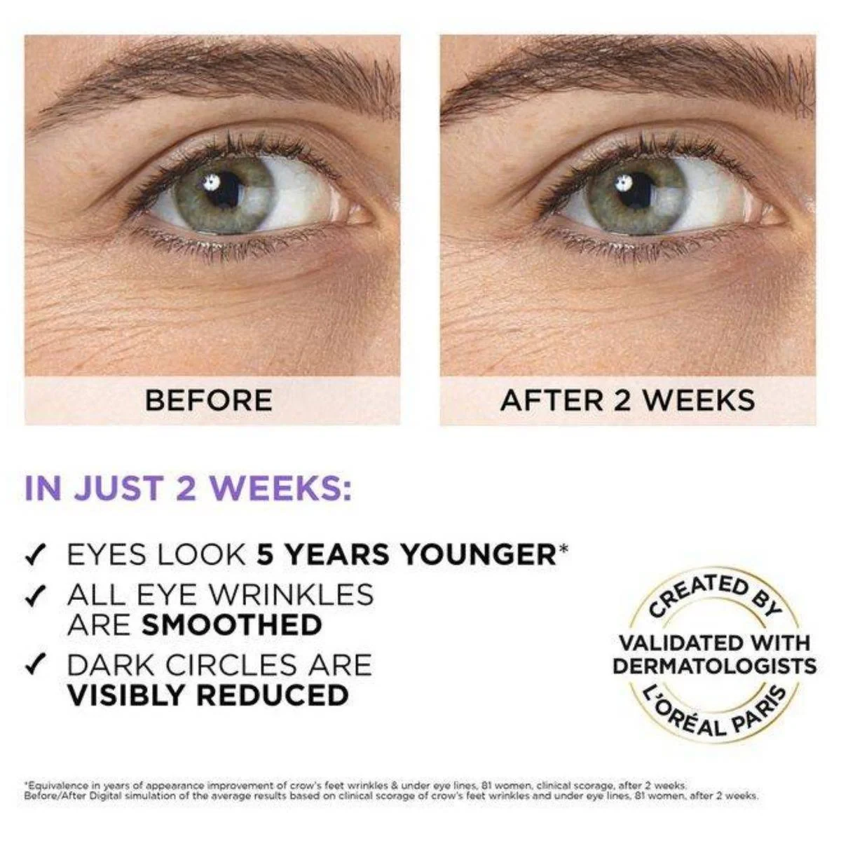 This eye serum is formulated with 2.5% Hyaluronic Acid, Caffeine, and Niacinamide. It instantly moisturizes and makes eyes look 5 years younger in just 2 weeks. Suitable for all skin types, it smooths eye wrinkles and reduces dark circles. Key Features Contains 2.5% Hyaluronic Acid Infused with Caffeine and Niacinamide Reduces dark circles Smooths eye wrinkles Suitable for all skin types Dermatologist tested Triple roller applicator Instantly moisturizes Aqua / Water, Glycerin, Hydroxyethylpiperazine Ethane Sulfonic Acid, Niacinamide, Sodium Hyaluronate, Caffeine, Citric Acid, Hydroxyacetophenone, Trisodium Ethylenediamine Disuccinate, Ascorbyl Glucoside, Caprylyl Glycol, Chlorphenesin.L'Oréal Paris: Innovators in beauty, offering a wide range of skincare and cosmetic products.Apply On Thoroughly Cleansed, Dry Skin Every Morning And Evening. Massage 4X From The Inner Corner Of Your Eye Up To Your Temple. Smooth Over Eyelids. Gently Tap In Any Excess With Fingers And Proceed With Your Usual Skincare Routine.For external use only. Avoid direct contact with eyes. If irritation occurs, discontinue use.