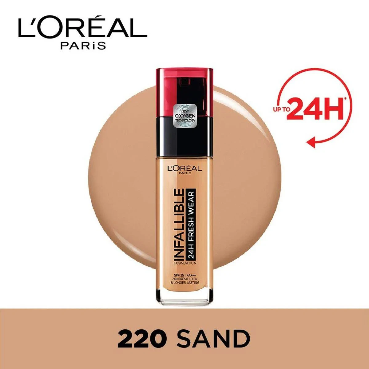 L'Oreal Paris Infallible 24Hr Fresh Wear Foundation in 220 Sand offers a weightless, full coverage with a natural matte finish. It provides up to 24-hour shine control and is suitable for all skin types. The foundation is waterproof, heatproof, and sweatproof, ensuring long-lasting wear. Features