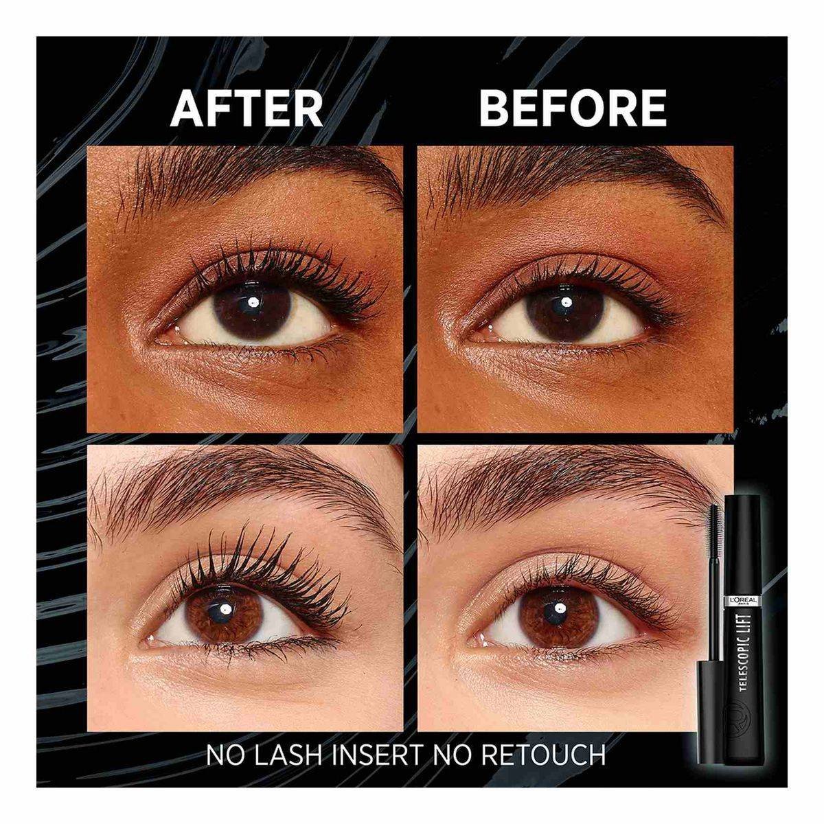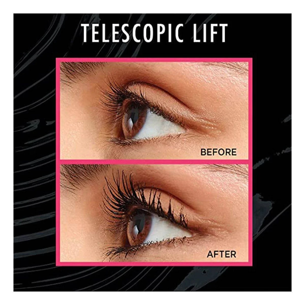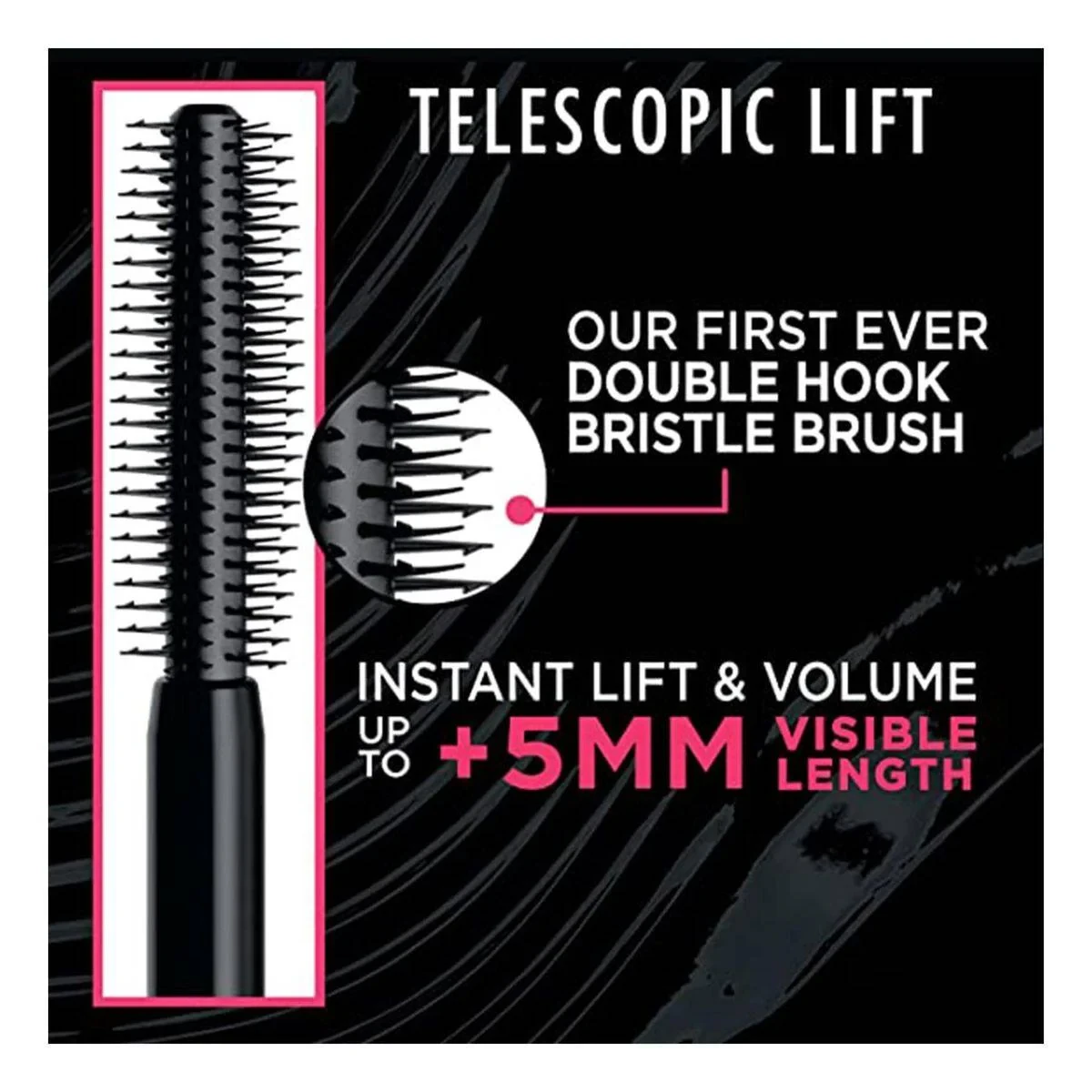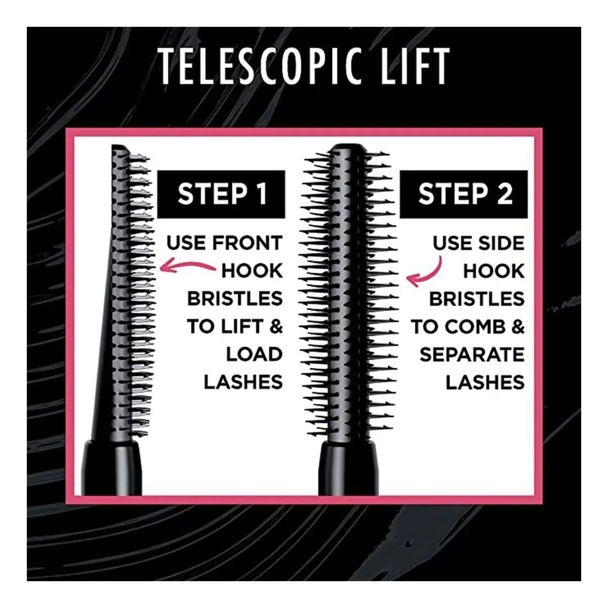 Loreal Paris Telescopic Lift Mascara Black offers an innovative double-hook bristle brush for instant lift and volume. Achieve visibly longer lashes with up to 18+5mm length. Perfect for dramatic eye looks. Key Features Instant lift and volume Double hook bristle brush Up to 18+5mm visible length Front-hook bristles to lift and load lashes Side-hook bristles to comb and separate lashes Key Ingredients: Water, Waxes, Polymers (designed for lift and length), Pigments (Carbon Black).Global leader in beauty, renowned for innovative and high-quality cosmetics.Use Front-Hook Bristles To Lift And Load Lashes. Use Side-Hook Bristles To Comb And Separate Lashes.For external use only. Do not use if eye is injured, irritated, or infected.