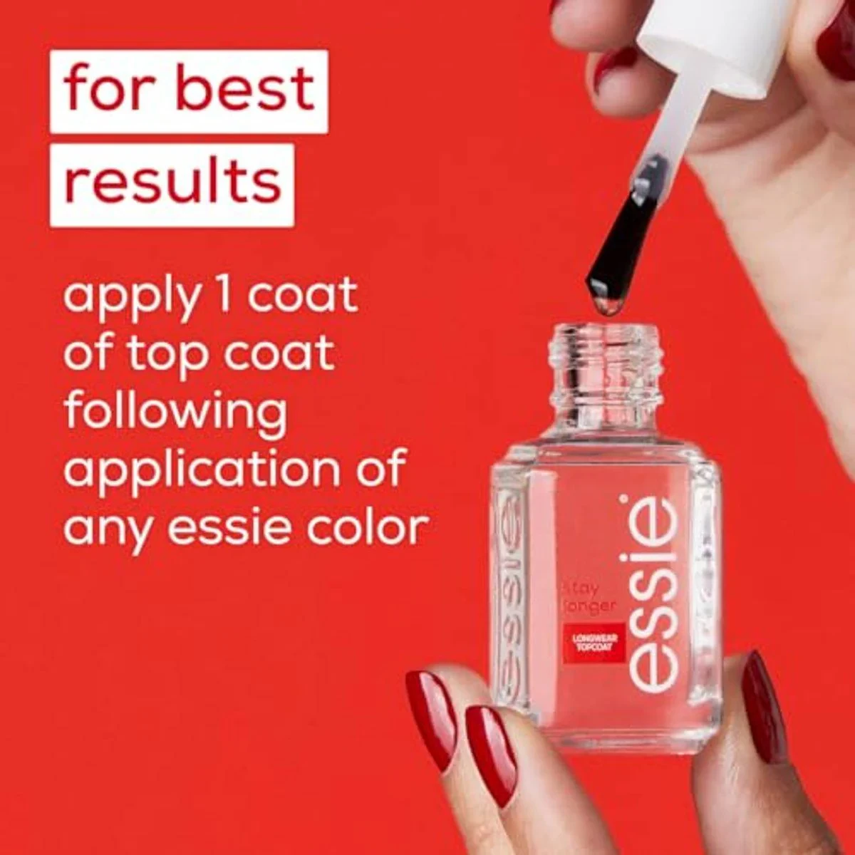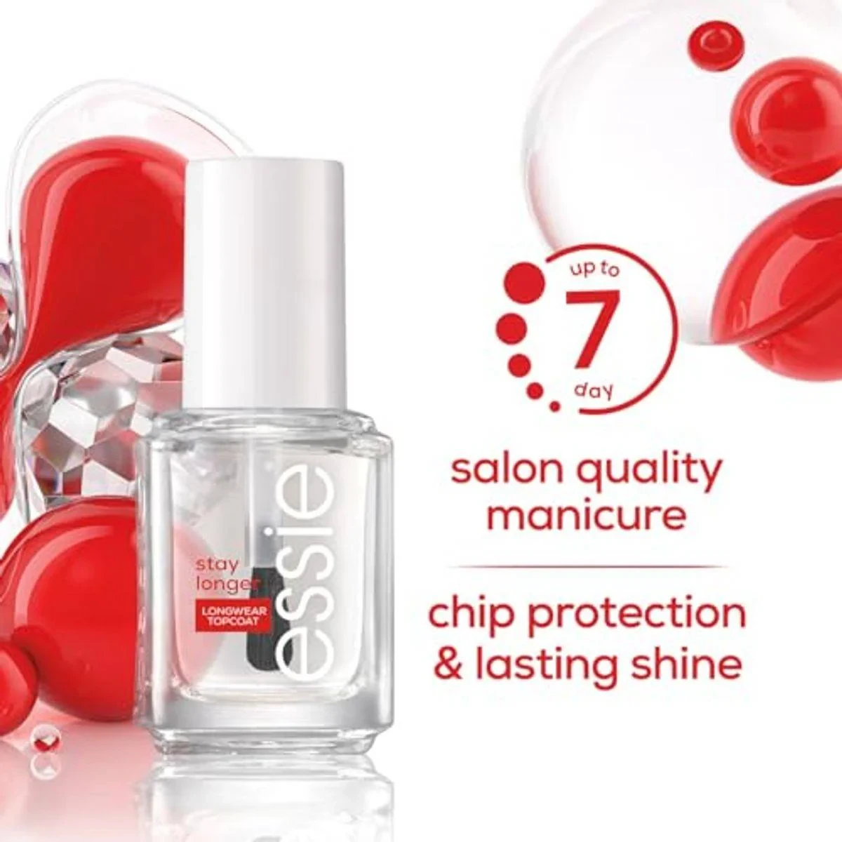Essie Nail Care Base Coat Stay Longer offers salon-quality manicure with chip protection and lasting shine. Its vegan formula ensures no animal-derived ingredients, providing a glossy finish that lasts up to 7 days. Key Features Salon quality manicure Chip protection Lasting shine Vegan formula Fast drying Free from DBP, Toluene, and Formaldehyde Long-lasting protection Easy glide brush Butyl Acetate, Ethyl Acetate, Nitrocellulose, Dipropylene Glycol Dibenzoate, Isopropyl Alcohol, Acetyl Tributyl Citrate, Cellulose Acetate Butyrate, Acrylates Copolymer, Sucrose Acetate Isobutyrate, Phthalic Anhydride/Glycerin/Glycidyl Decanoate Copolymer, Alcohol Denat [+/- May Contain Ci 60725 / Violet 2]Essie: Salon-quality nail care with a wide range of vibrant shades and long-lasting formulas.Apply One Coat Of Essie Base Coat, Followed By Two Coats Of Essie Nail Color, Then Apply Stay Longer Top Coat For Chip Protection And Lasting Shine.Flammable. Keep away from heat and open flame. For external use only.