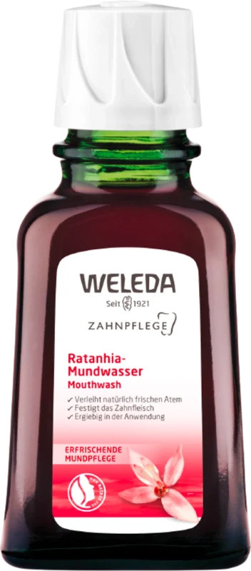 Weleda Ratanhia Mouthwash is a natural dental care solution that refreshes breath and strengthens gums. Made with organic ratanhia roots and myrrh, it tones and tightens gums while essential oils provide lasting freshness. Ideal for daily use, this vegan-friendly mouthwash is NaTrue certified for natural and organic cosmetics. Key Features Freshens breath and strengthens gums Contains natural plant extracts Economical concentrate NaTrue certified Includes essential oils Suitable for daily use Alcohol, Aqua, Commiphora Myrrha Resin Extract, Krameria Triandra Root Extract, Aroma, Limonene, Linalool, Eugenol, Aesculus Hippocastanum (Horse Chestnut) Bark Extract, Calcium Fluoride, Silver, Magnesium Sulfate.Weleda: Pioneers in natural cosmetics and holistic wellness since 1921.Use a few splashes in a half-full glass of lukewarm water for thorough rinse and gargle.Do not swallow, keep out of reach of children, and check ingredients for potential allergens before use.