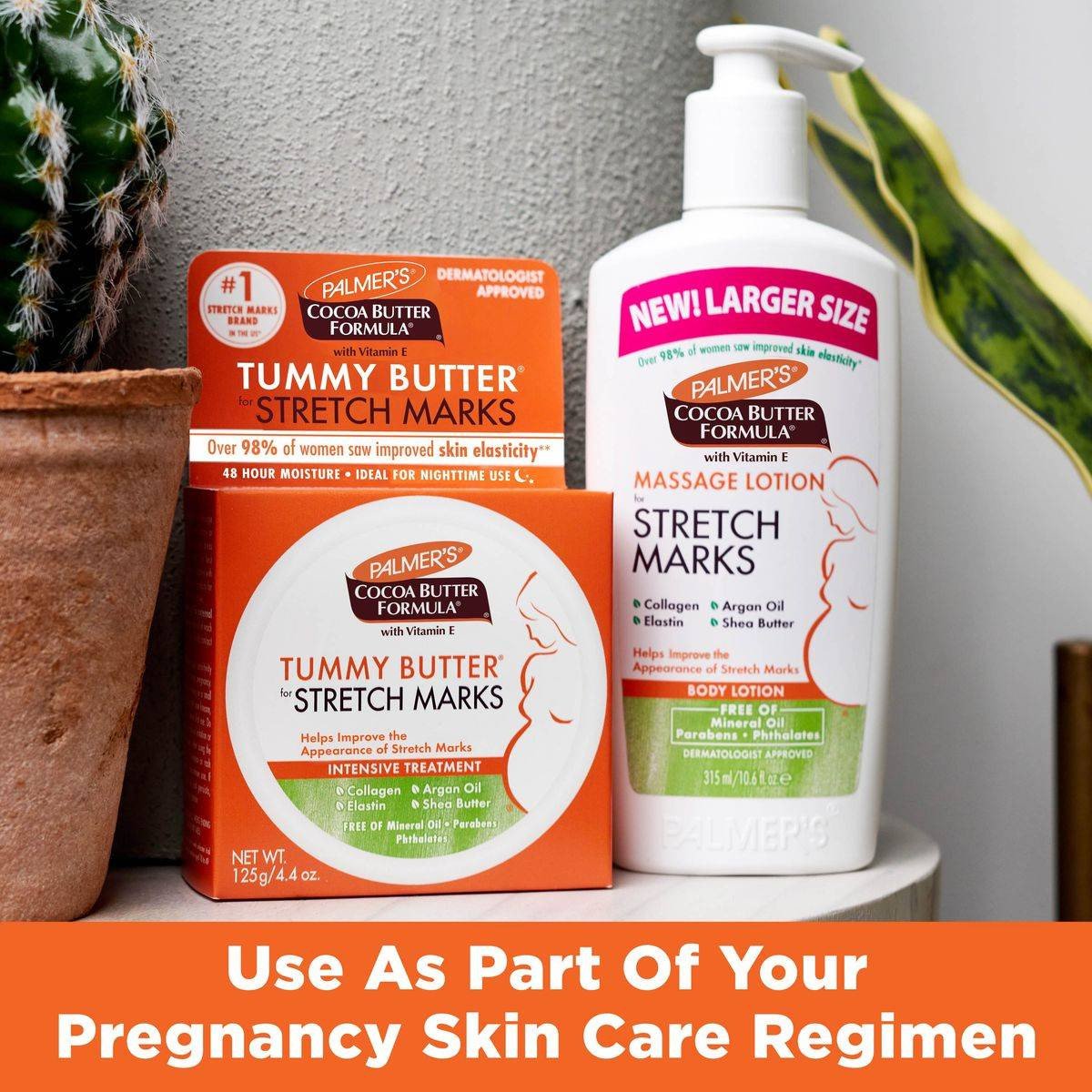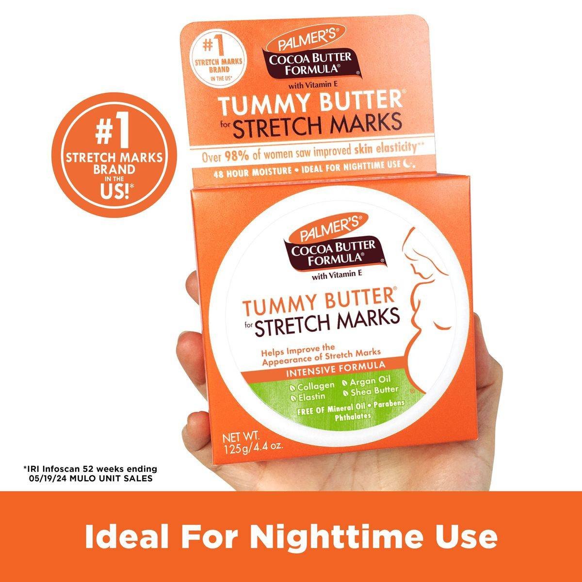 Palmer's Cocoa Butter Formula Tummy Butter is an intensive treatment for stretch marks, enriched with Cocoa Butter, Shea Butter, and Vitamin E. Ideal for nighttime use, it provides 48-hour moisture and helps improve skin elasticity. Features