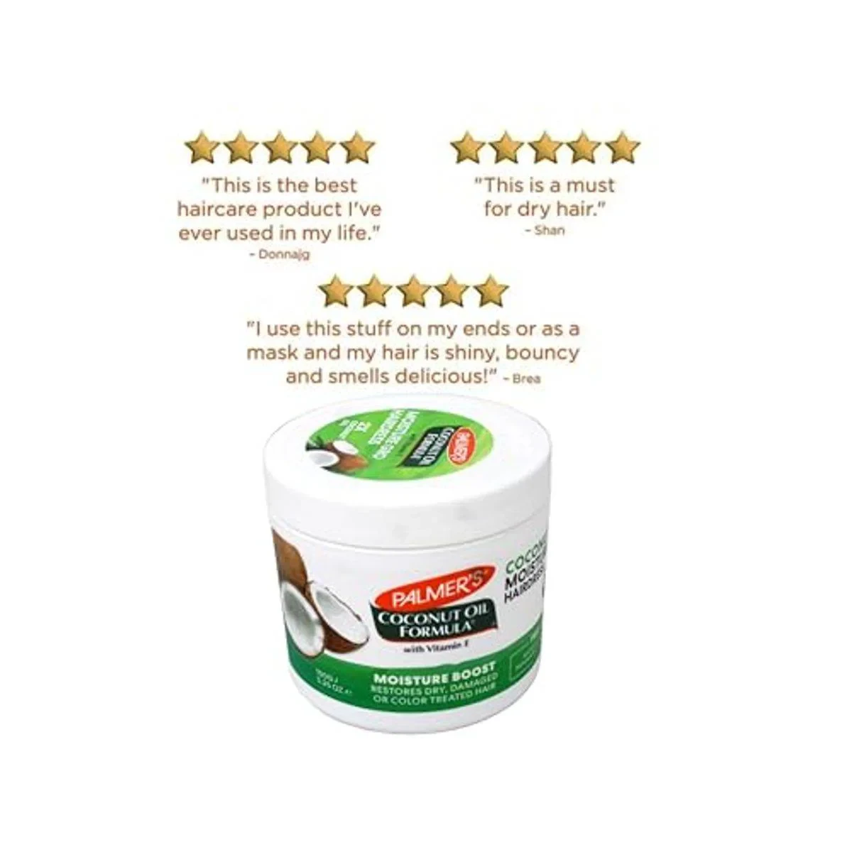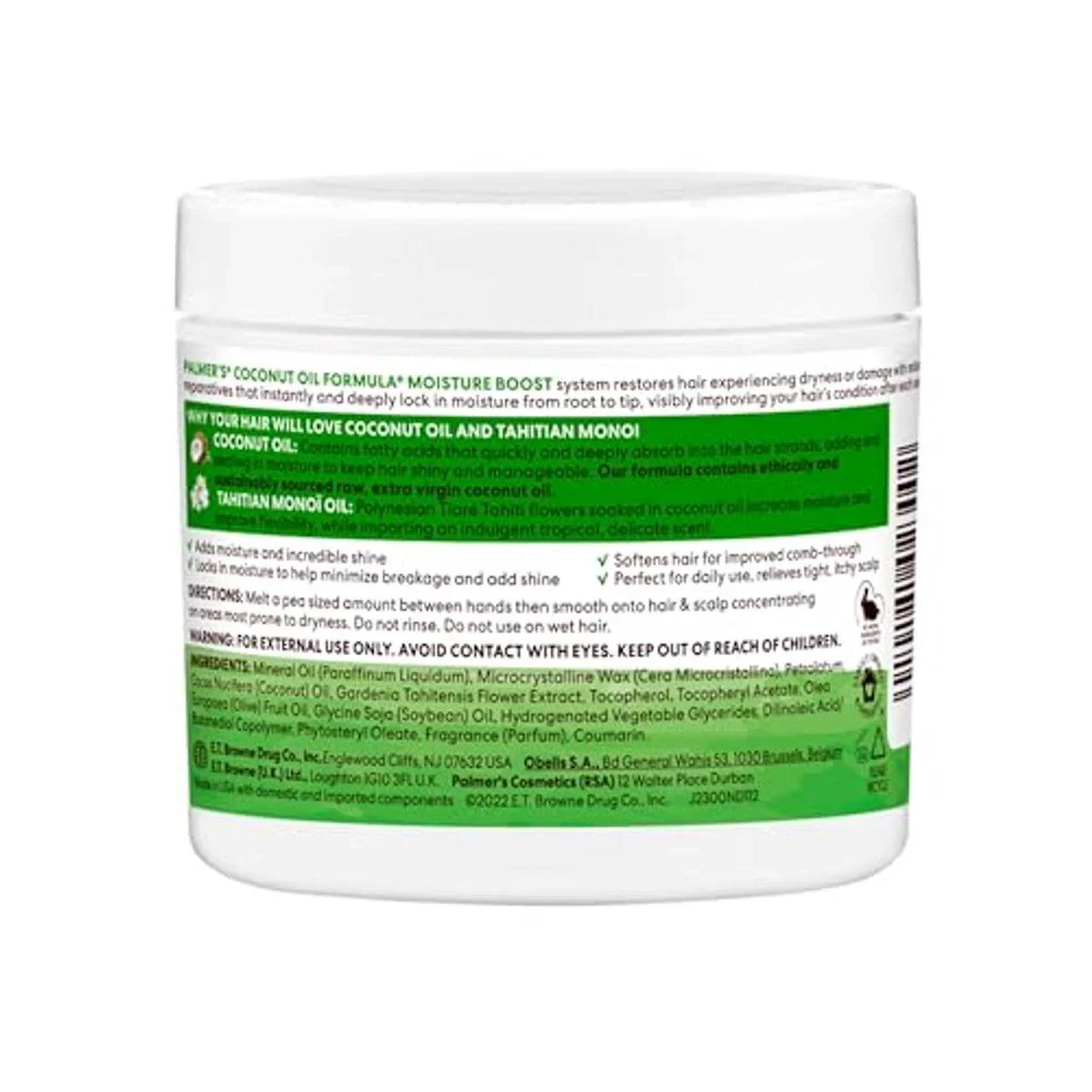 Palmers Coconut Oil Formula Hair Conditioner is designed to deeply moisturize and restore dry, damaged, or color-treated hair. Enriched with Vitamin E and raw coconut oil, it helps prevent breakage and strengthens hair, leaving it shiny and bouncy. Ideal for daily use on curly, coarse hair types. Key Features Deep conditioning treatment Enriched with Vitamin E and Coconut Oil Prevents breakage and strengthens hair Phthalate-free, sulfate-free, dye-free Creates a protective moisture barrier Suitable for dry, damaged, or color-treated hair Mineral oil (paraffinum liquidum), microcrystalline wax (cera microcristallina), petrolatum, cocos nucifera (coconut) oil, tocopherol, helianthus annuus (sunflower) seed oil, gardenia tahitensis flower extract, olea europaea (olive) fruit oil, glycine soja (soybean) oil, lanolin, fragrance (parfum), coumarin.Renowned for its nourishing skincare and haircare products, Palmer's specializes in coconut oil-infused formulas.Apply a pea-sized amount to clean, dry hair & scalp. Do not rinse.Free of sulfates, parabens, phthalates, gluten & dyes.