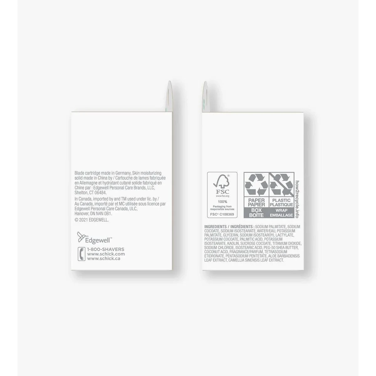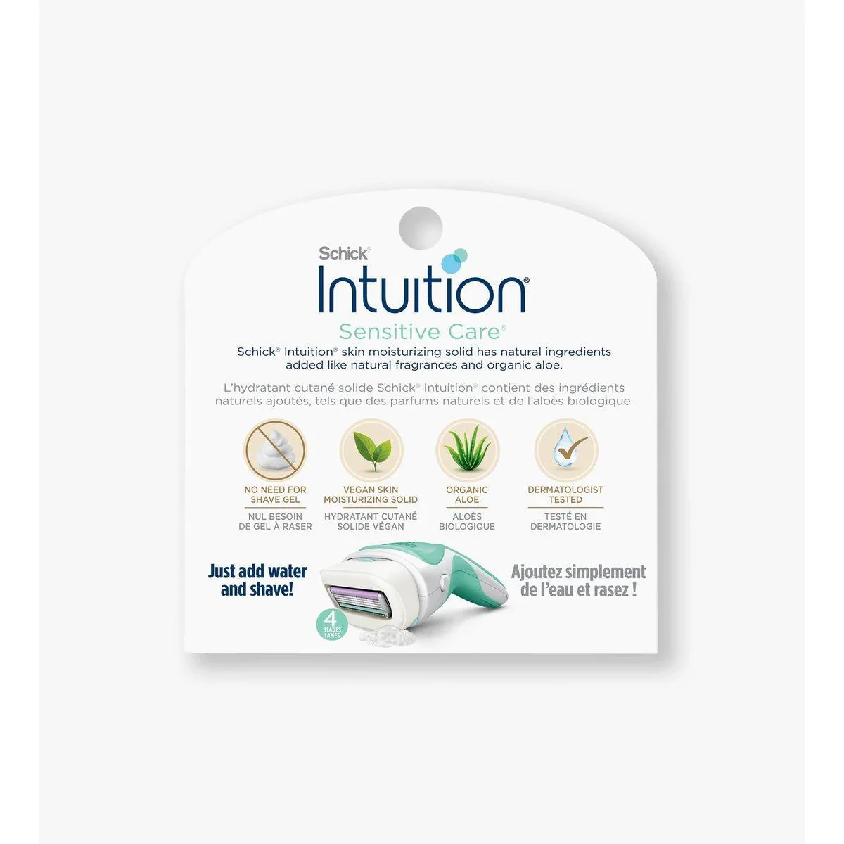 The Schick Intuition Sensitive Care Refill Cartridges are designed for a smooth, effortless shave. Infused with organic aloe, these cartridges lather and moisturize during shaving, eliminating the need for shave gel. The 4-blade pivoting head glides along body contours, making it ideal for sensitive skin. Perfect for first-time shavers, it minimizes nicks and cuts. Key Features Lathers and shaves in one step Moisturizing bar with organic aloe 4 blades with pivoting head Vegan and hypoallergenic formula Dermatologist tested Perfect for first-time shavers Sodium Palmitate, Sodium Cocoate, Sodium Isostearate, Water/Eau, Potassium Palmitate, Glycerin, Sodium Isostearoyl Lactylate, Potassium Cocoate, Palmitic Acid, Potassium Isostearate, Kaolin, Sucrose Cocoate, Titanium Dioxide, Sodium Chloride, Isostearic Acid, PEG-50 Shea Butter, Coconut Acid, Fragrance/Parfum, Tetrasodium Etidronate, Pentasodium Pentetate, Aloe Barbadensis Leaf Extract, Camellia Sinensis Leaf Extract.Schick: Innovators in personal care, offering advanced shaving solutions for sensitive skin.Remove the razor refill from its packaging. Align the refill with the handle and slide it on until it clicks into place. Wet your skin and the razor. Apply gentle pressure and glide the razor over your skin in the direction of hair growth. Rinse the blades after each stroke for a smooth shave.Contact your health-care provider immediately if you suspect that you have a medical problem.