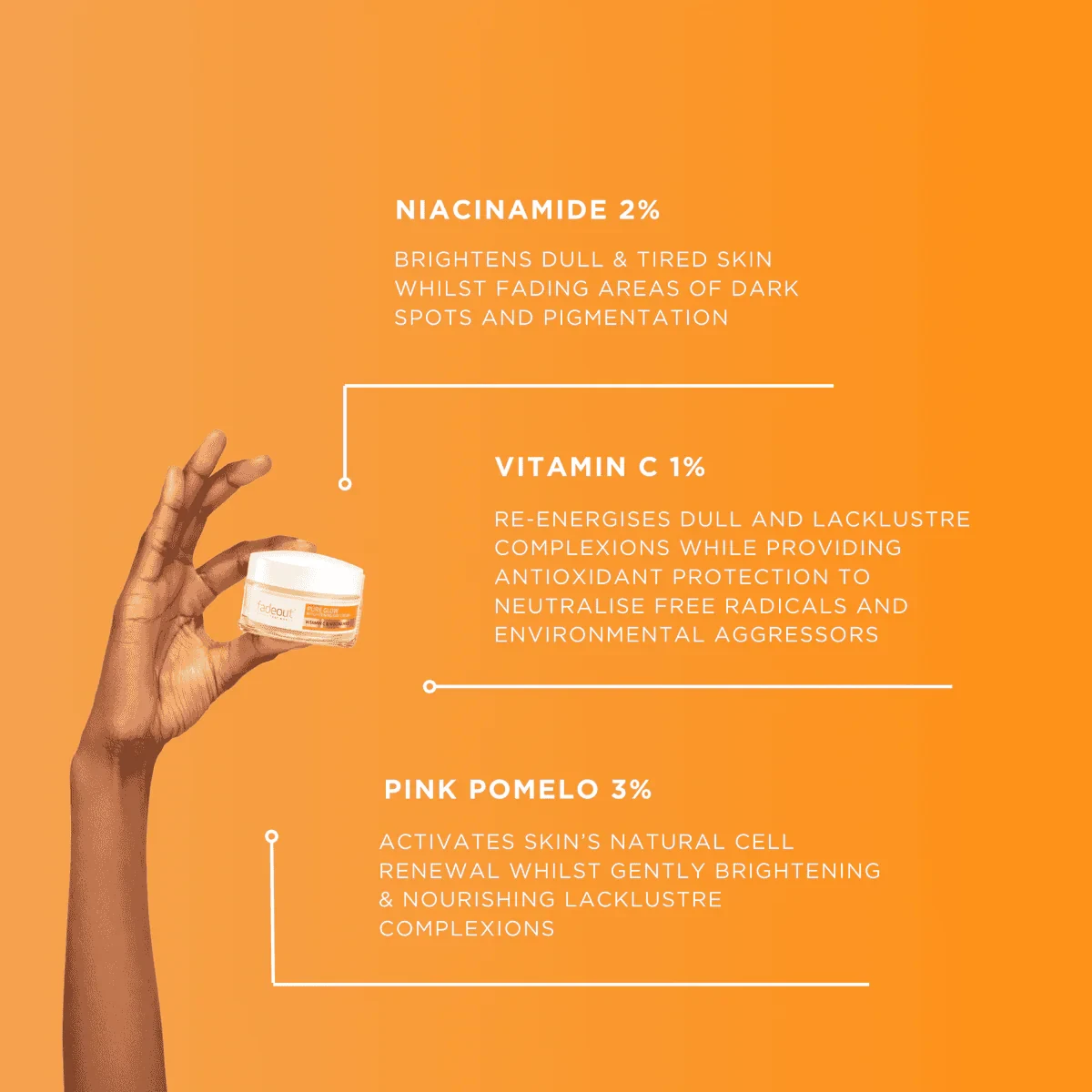 Aqua, Glycerin, Caprylic/Capric Triglyceride, Propylheptyl Caprylate, Niacinamide, Dimethicone, Sodium Ascorbyl Phosphate, Citrus Paradisi (Grapefruit) Fruit Extract, Tocopherol Acetate, Persea Gratissima (Avocado) Oil, Squalene, Olea Europae (Olive) Fruit Oil, Butyrospermum Parkii.Fade Out: Experts in skincare, known for brightening and nourishing products with Vitamin C and Niacinamide.After cleansing and optional use of serum, apply evenly over face, can be used on hands, neck, shoulders, décolletage.For external use only. Avoid contact with eyes. If irritation occurs, discontinue use.