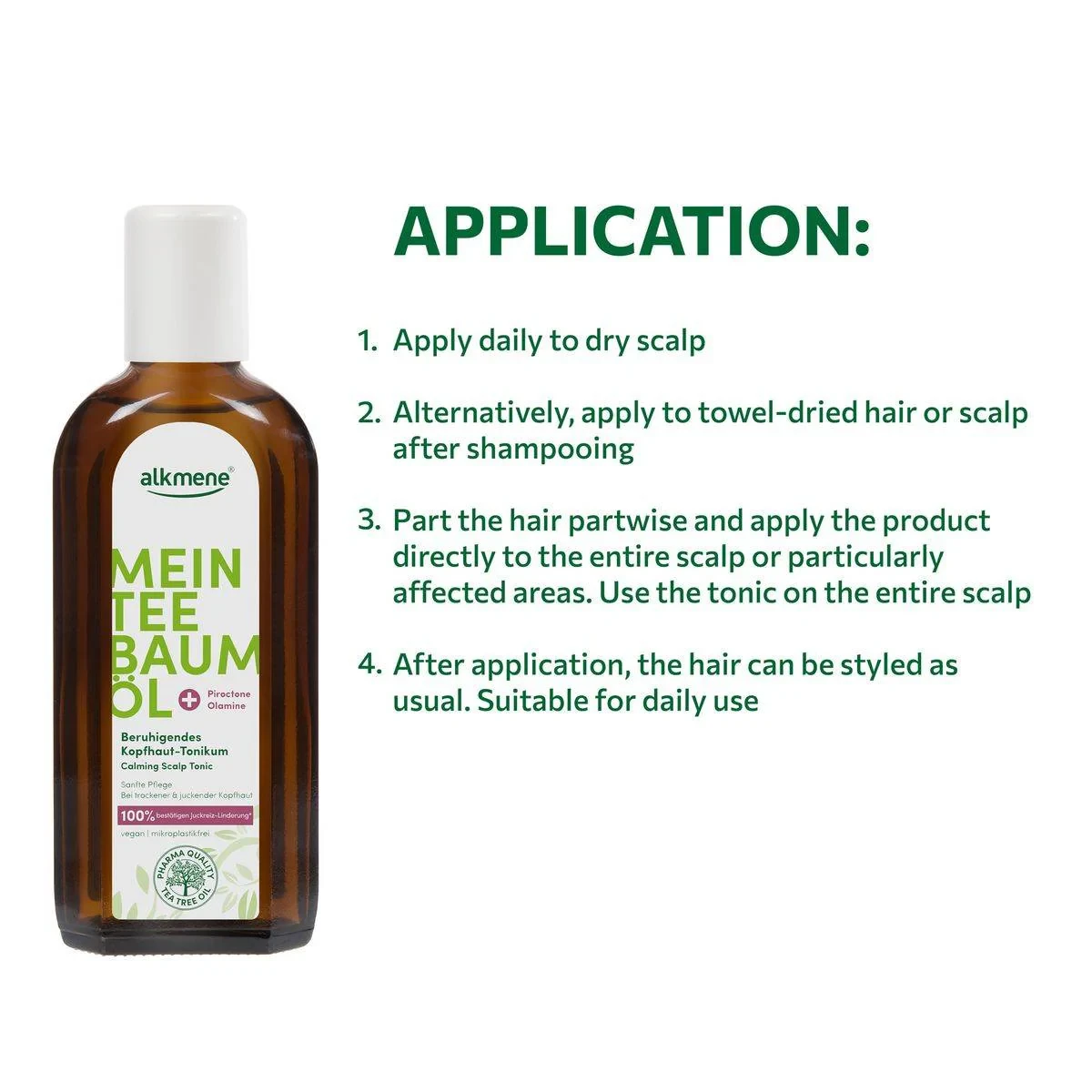 Alkmene Tea Tree Calming Scalp Tonic is designed to soothe and refresh the scalp. Infused with tea tree oil, it provides relief from scalp discomfort and promotes a healthier scalp environment. Suitable for daily use. Key Features Relieves itching Promotes healthier scalp Microplastic-free Vegan formula Made in Germany Antibacterial and antiseptic Moisturizes dry scalp Suitable for daily use Aqua (Water), Alcohol Denat., Panthenol, Melaleuca Alternifolia (Tea Tree) Leaf Oil, Parfum (Fragrance), Peg 40 Hydrogenated Castor Oil, Piroctone Olamine, Limonene, Citric Acid, Sodium Hydroxide.Alkmene: Natural personal care with a focus on scalp health using tea tree oil. Vegan and microplastic free.Apply daily to dry or towel dried scalp. Part hair and apply directly to the scalp. Do not rinse out.For External Use Only. Avoid Contact With Eyes. Discontinue Use If Irritation Occurs.