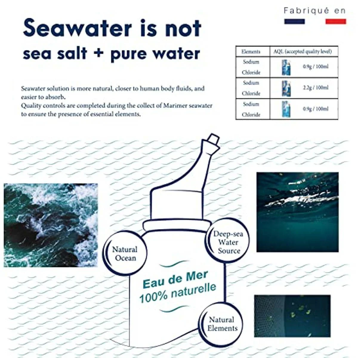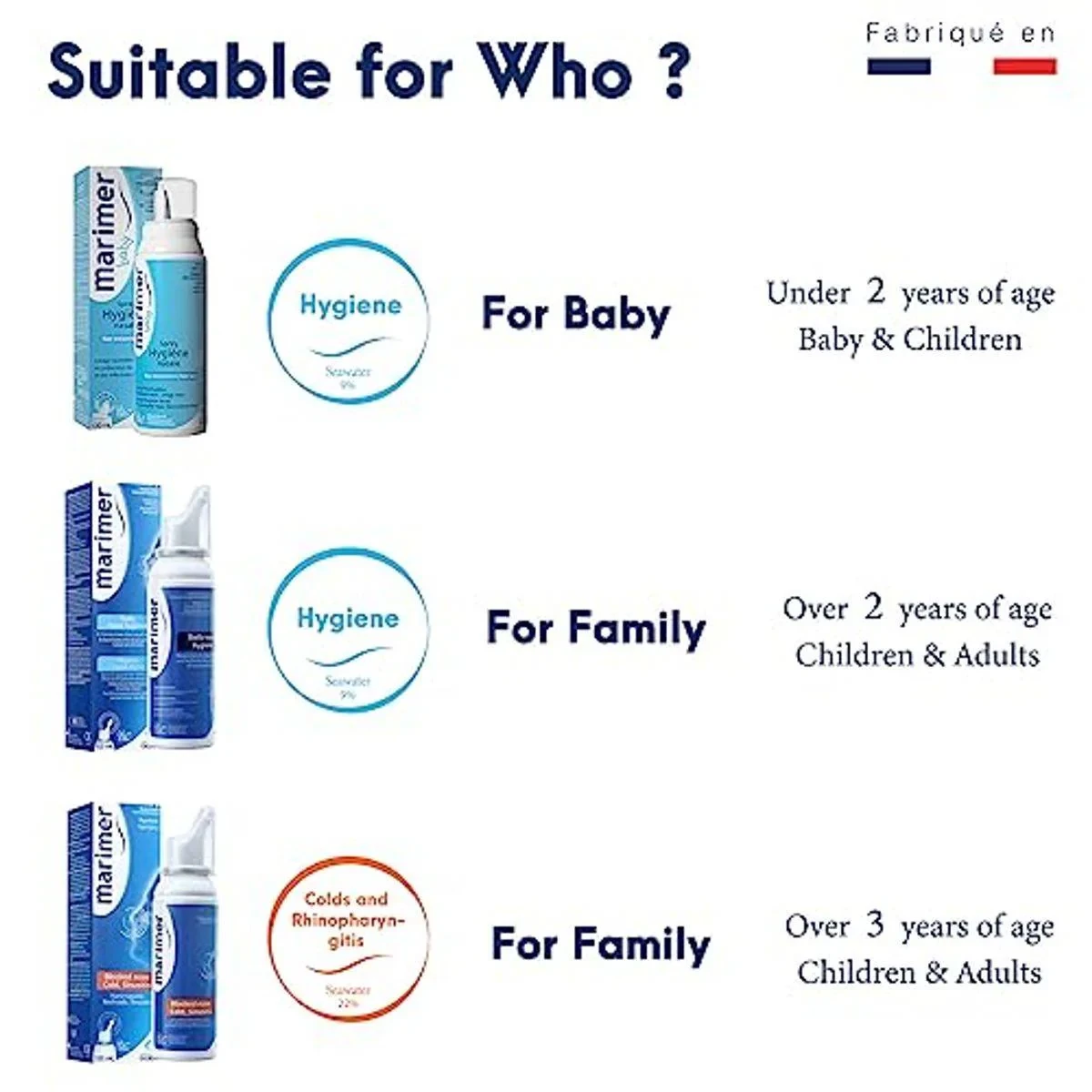 Marimer Isotonic Nasal Spray is designed for daily nasal hygiene. It contains isotonic seawater, which moisturizes and cleanses the nasal mucous membranes, facilitating the evacuation of nasal secretions. Ideal for those with allergic rhinitis, it is suitable for the entire family. Key Features Daily nasal hygiene Moisturizes nasal mucous Facilitates evacuation of nasal secretions Recommended for allergic rhinitis Isotonic seawater solution Suitable for adults and children Clinically tested Environmentally friendly packaging Isotonic Sea Water (Equivalent To 9 G/L Of Salts), Purified Water.Marimer Isotonic Nasal Spray is designed for daily nasal hygiene. It contains isotonic seawater, which moisturizes and cleanses the nasal mucous membranes, facilitating the evacuation of nasal secretions. Ideal for those with allergic rhinitis, it is suitable for the entire family.Spray 1-2 Sprays Into Each Nostril. Use 1 To 3 Times Daily As Needed.Keep Out Of The Sight And Reach Of Children.