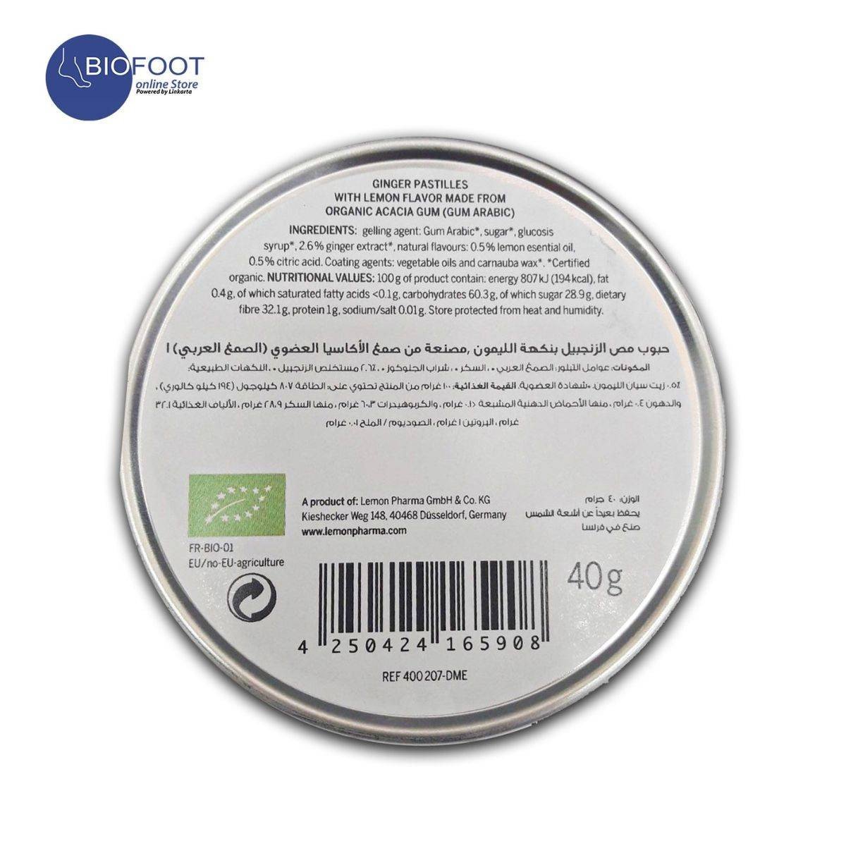 Ginjer Organic Ginger Pastilles Lemon are crafted from natural acacia gum and ginger extract, providing a long-lasting taste and health benefits. Ideal for relieving nausea and supporting digestive health. Key Features Made from organic acacia gum Contains 2.6% ginger extract Flavored with lemon essential oil 100% vegan ingredients Certified organic Long-lasting flavor Beneficial for mouth and throat Gelling Agent: Gum Arabic, Sugar, Glucose Syrup, 2.6% Ginger Extract, Natural Flavours: 0.5% Lemon Essential Oil, 0.5% Citric Acid. Coating Agents: Vegetable Oils And Carnauba Wax.Ginjer Organic Ginger Pastilles Lemon are crafted from natural acacia gum and ginger extract, providing a long-lasting taste and health benefits. Ideal for relieving nausea and supporting digestive health.Pastilles To Suck.Store Protected From Heat And Humidity.