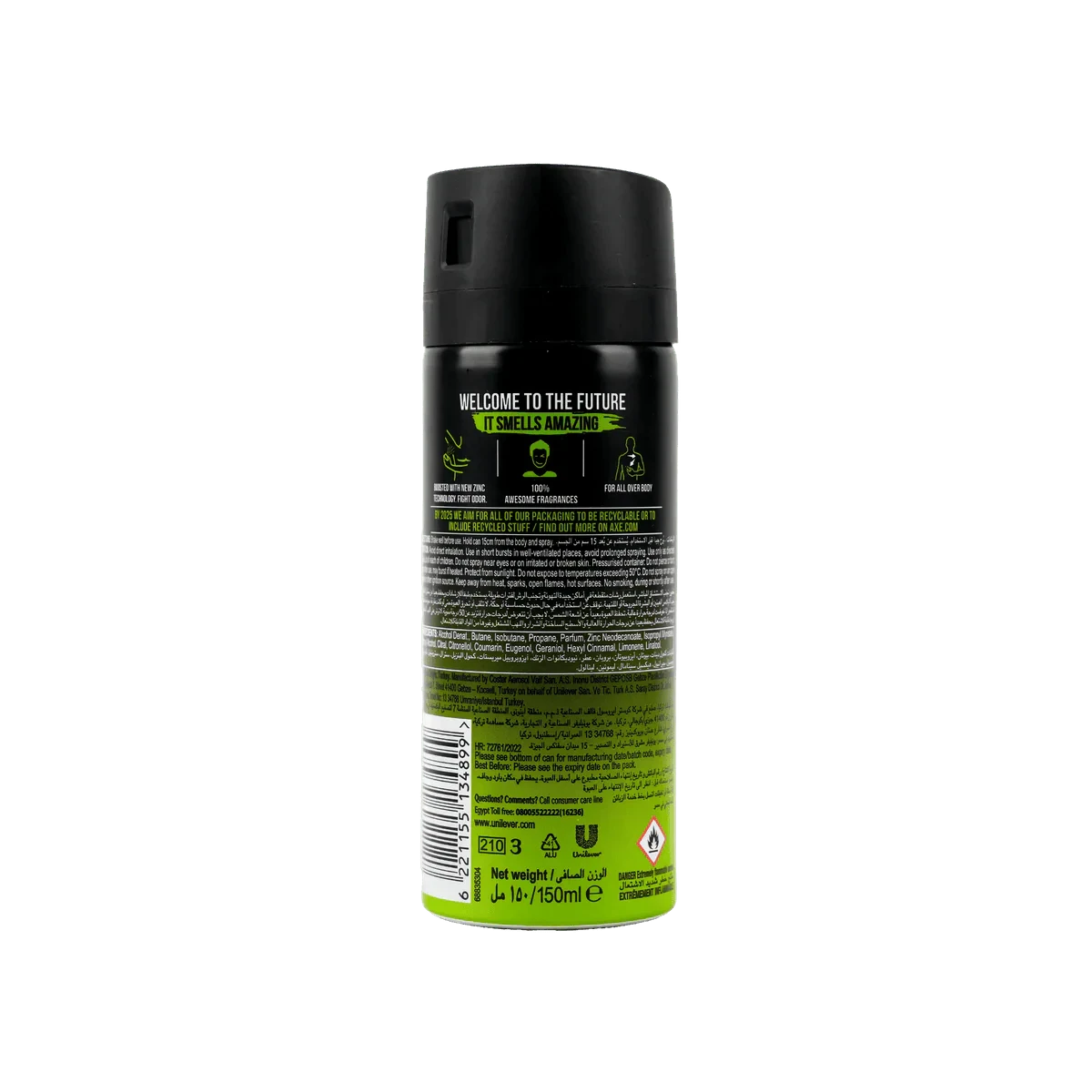Axe Deodorant Spray Epic Fresh 150ml offers a refreshing grapefruit and tropical pineapple scent. Designed for all-over body use, it provides 48 hours of nonstop freshness. Ideal for daily grooming, this deodorant fights odor with innovative zinc technology. Key Features 48 hours non-stop freshness Grapefruit & Tropical Pineapple scent Deodorant & body spray Fights odor with zinc technology Acohol Denat., Butane, Isobutane, Propane, Parfum, Zinc Neodecanoate, Citronellol, Coumarin, Eugenol, Geraniol, Hexyl Cinnamal, Limonene, Linalool.Leading personal care brand known for innovative fragrances and grooming products.Hold can 15cm from the body and spray. Use in short bursts in well-ventilated places.Use in short bursts in well-ventilated places, avoid prolonged spraying. Use only as directed. Do not spray near eyes or on irritated or broken skin. Pressurised container. Do not pierce or burn, even after use. Protect from sunlight. Do not expose to temperatures exceeding 50°C. Keep away from heat, sparks, open flames, hot surfaces. No smoking.