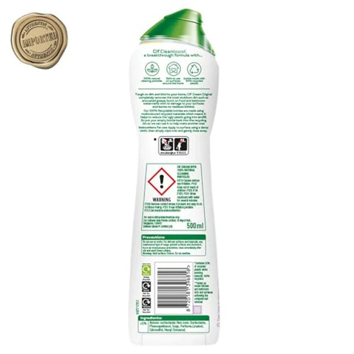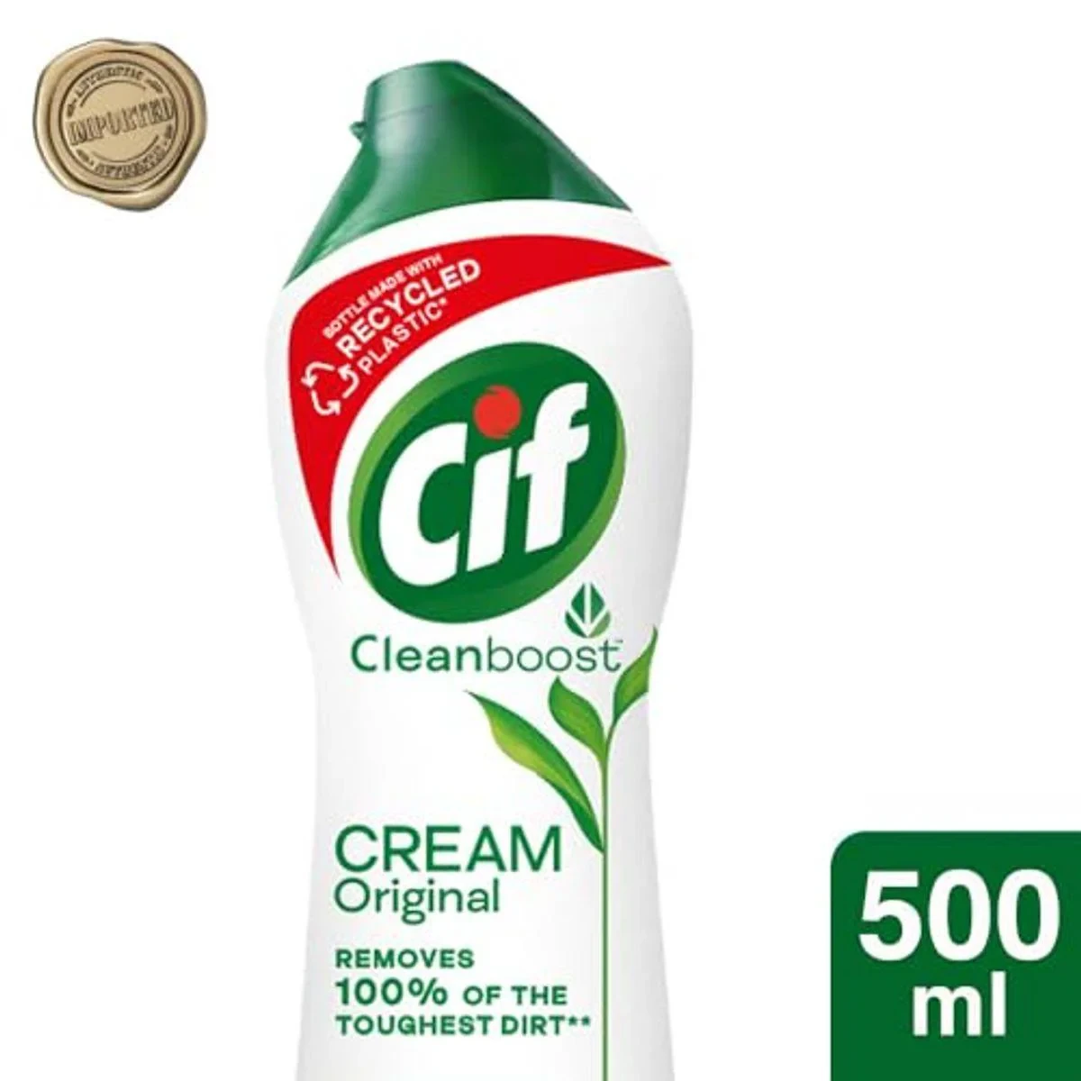 Jif Cream Cleaner Original 500ml is a powerful cleaning solution designed to remove the toughest dirt and grime. Its Cleanboost formula ensures surfaces are left sparkling clean with a 100% shine. Safe for use on various surfaces around the home, including tiles, marble flooring, and white shoes. The bottle is made with recycled plastic, emphasizing sustainability. Key Features Leaves surfaces sparkling clean with 100% shine Removes 100% of the toughest dirt Safe to use on surfaces around the home Easy to rinse Works on tiles, marble flooring, and white shoes Bottle made with recycled plastic Water, Calcium Carbonate (abrasive), Anionic and Nonionic Surfactants, Perfume.Jif is a trusted brand in home cleaning, known for its effective cream cleaners that tackle tough dirt and grime.Cleaning: Apply cream directly to the surface or a damp sponge. Rub gently to remove tough stains, then rinse thoroughly.CLEANER WARNING: CAUSES SERIOUS EYE IRRITATION. Keep out of reach of children. Do not ingest.