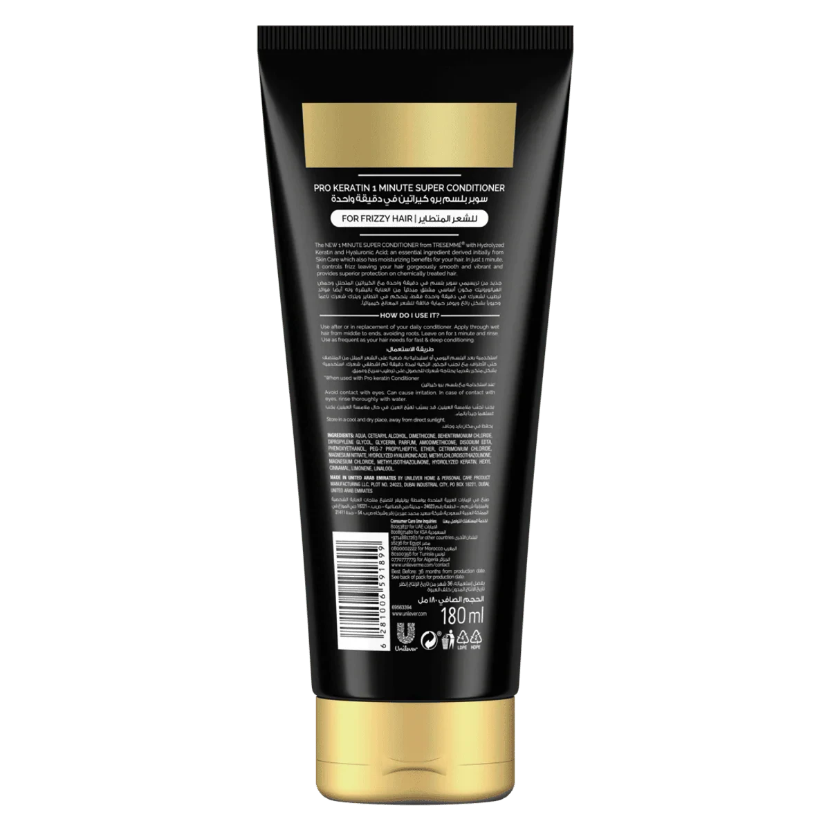 Aqua, Cetearyl Alcohol, Dimethicone, Behentrimonium Chloride, Dipropylene Glycol, Glycerin, Parfum, Amodimethicone, Disodium Edta, Phenoxyethanol, Peg-7 Propylheptyl Ether, Cetrimonium Chloride, Magnesium Nitrate, Hydrolyzed Hyaluronic Acid, Methylchloroisothiazolinone, Magnesium Chloride, Methylisothiazolinone, Hydrolyzed Keratin, Hexyl Cinnamal, Limonene, Linalool.Tresemme 1 Minute Super Conditioner Pro Keratin is designed to intensely moisturize and control frizz for up to 72 hours. Formulated with hydrolyzed keratin and hyaluronic acid, it leaves hair smooth and vibrant. Ideal for chemically treated hair, it provides superior protection and manageability.Use After Or In Replacement Of Your Daily Conditioner. Apply Through Wet Hair From Middle To Ends, Avoiding Roots. Leave On For 1 Minute And Rinse.Avoid Contact With Eyes. Can Cause Irritation. In Case Of Contact With Eyes, Rinse Thoroughly With Water.