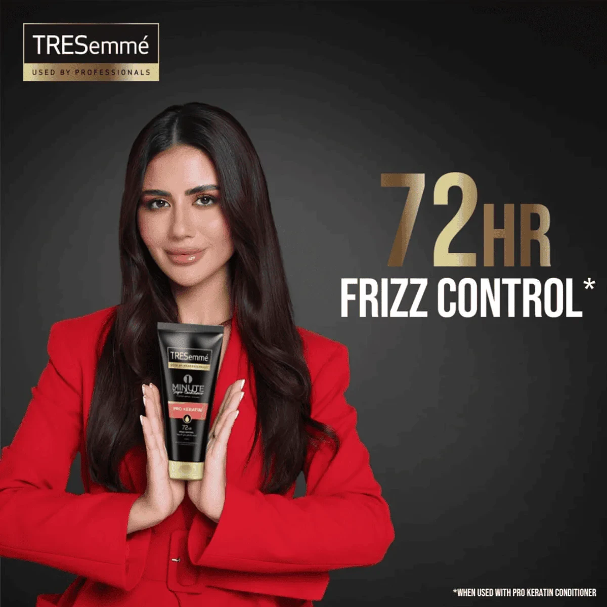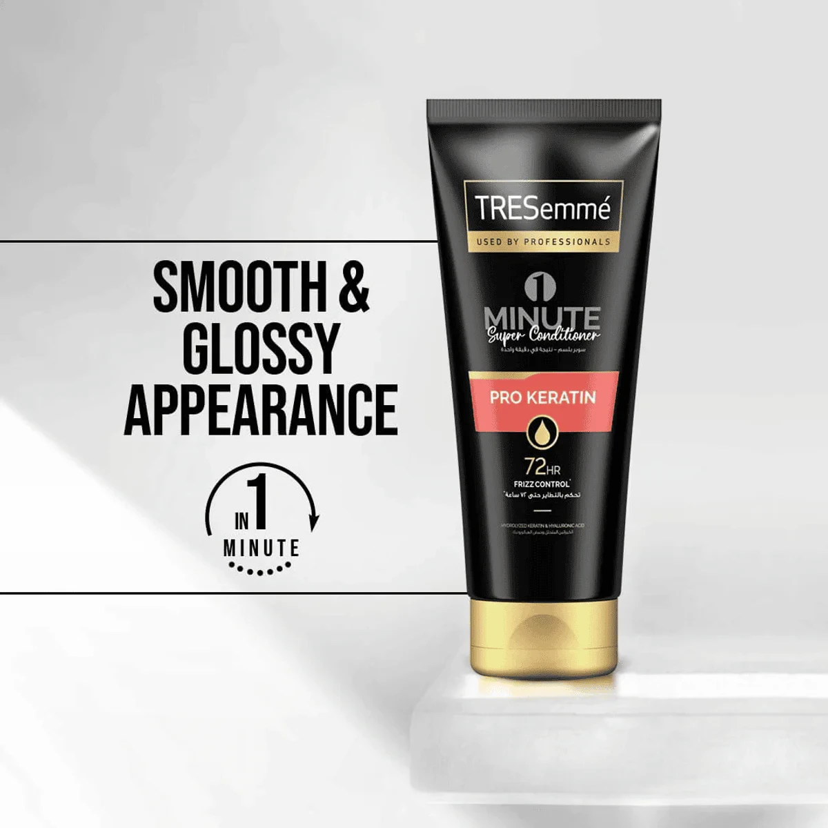 Tresemme 1 Minute Super Conditioner Pro Keratin is designed to intensely moisturize and control frizz for up to 72 hours. Formulated with hydrolyzed keratin and hyaluronic acid, it leaves hair smooth and vibrant. Ideal for chemically treated hair, it provides superior protection and manageability. Key Features