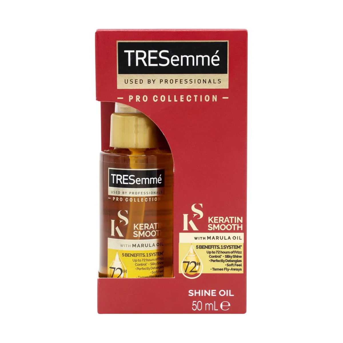 TRESemmé Keratin Smooth Shine Oil is designed to provide soft, shiny, frizz-free hair with its advanced formula comprising hydrolysed keratin and marula oil. Offers up to 72 hours of frizz control, detangles knots, boosts shine, and adds softness for silky hair. Perfect for daily use on all hair types. Key FeaturesFights frizz Cyclopentasiloxane, Palm Oil, Ethylhexyl Methoxycinnamate, Coconut Oil, Prunus Amygdalus Dulcis (Sweet Almond) Oil, Limonene, Linalool.TRESemmé Keratin Smooth Shine Oil is designed to provide soft, shiny, frizz-free hair with its advanced formula comprising hydrolysed keratin and marula oil. Offers up to 72 hours of frizz control, detangles knots, boosts shine, and adds softness for silky hair. Perfect for daily use on all hair types.Rub 3-4 Pumps In The Palms Of Your Hands. Apply Evenly Through The Lengths And Ends Of Clean, Dry Hair. Can Be Used On Wet Hair As A Nourishing Treatment Or Pre-Styling.Avoid Contact With Eyes. Can Cause Irritation. In Case Of Contact With Eyes, Rinse Thoroughly With Water.