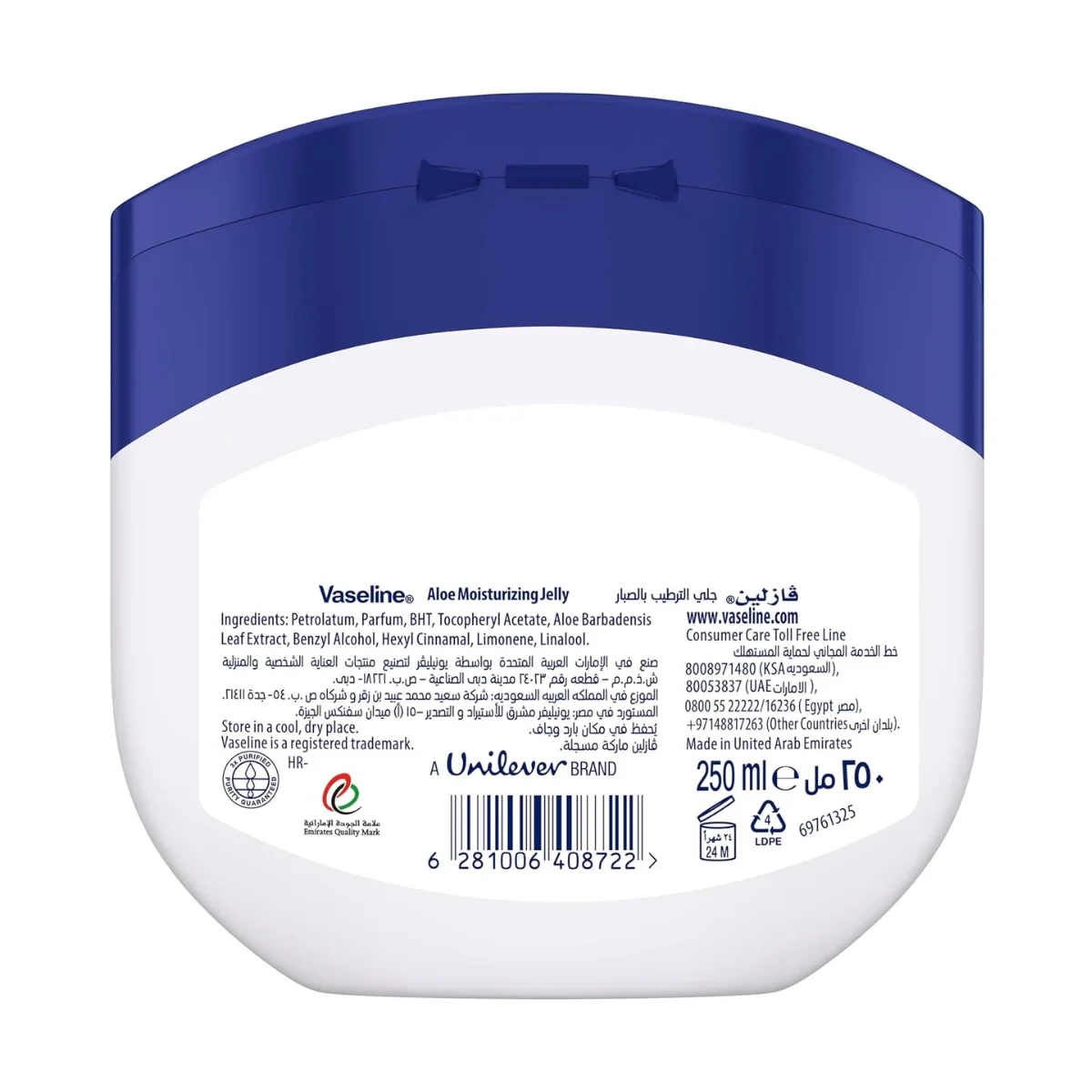 Vaseline Petroleum Jelly Aloe Fresh is a moisturizing jelly enriched with Aloe Vera, designed to soothe and hydrate dry skin. Dermatologically tested and hypoallergenic, it provides relief for sun-exposed skin and locks in moisture. Ideal for daily use, it absorbs quickly without a greasy feel, making it suitable for all skin types. Key Features Made with triple-purified petroleum jelly Soothes sun-exposed skin Locks in moisture Dermatologically tested Hypoallergenic and non-comedogenic Enriched with Aloe Vera Clinically proven to heal dry skin Light hydrating formula Non-greasy feel Suitable for sensitive skin Aloe Barbadensis, Benzyl Alcohol, Benzyl Salicylate, Butylphenyl Methylpropional, Cucumis Sativus Oil, Hexyl Cinnamal, Parfum, Petrolatum.Vaseline: Trusted skincare brand known for healing and protecting skin with its iconic petroleum jelly products.Apply as needed to dry skin areas for soothing and moisturizing effects.Users are advised to read labels, warnings, and directions before using the product.