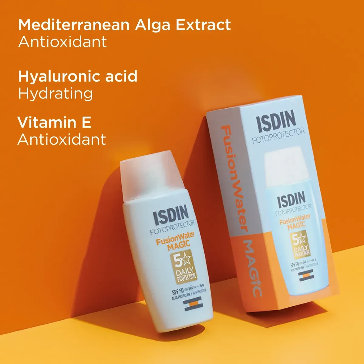Isdin Fotoprotector Fusion Water Magic Fluid SPF50 offers high UV protection with a lightweight, hydrating formula. Ideal for daily use, it contains antioxidants like Vitamin E and Hyaluronic Acid to protect and nourish the skin. Key Features SPF 50 sun protection High protection against UV rays Hydrates intensely Antioxidant properties Oil control formula No irritation to eyes Suitable for daily use Protects against oxidative damage Mediterranean Alga Extract, Hyaluronic Acid, Vitamin E.Innovative skincare brand specializing in high protection sunscreens.Apply Generously Before Sun Exposure.For external use only. Avoid contact with eyes. Reapply frequently to maintain protection, especially after swimming or toweling.