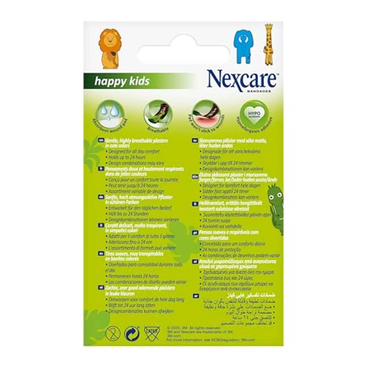 Nexcare Bandages Happy Kids Animals are designed for all-day comfort and hold up to 24 hours. They are breathable and come in fun animal designs. Features Gentle, highly breathable plasters Designed for all-day comfort Holds up to 24 hours Design combinations may vary Key Materials: Plastic/Sheer backing with printed design; Non stick pad; Adhesive.Innovative solutions for everyday care Trusted in healthcare and home settingsApply To Clean, Dry Skin. Ensure The Area Is Clean And Dry Before Application.Discontinue use immediately if a rash or irritation occurs. For single use only. Consult a doctor if the wound does not heal or if signs of infection occur.