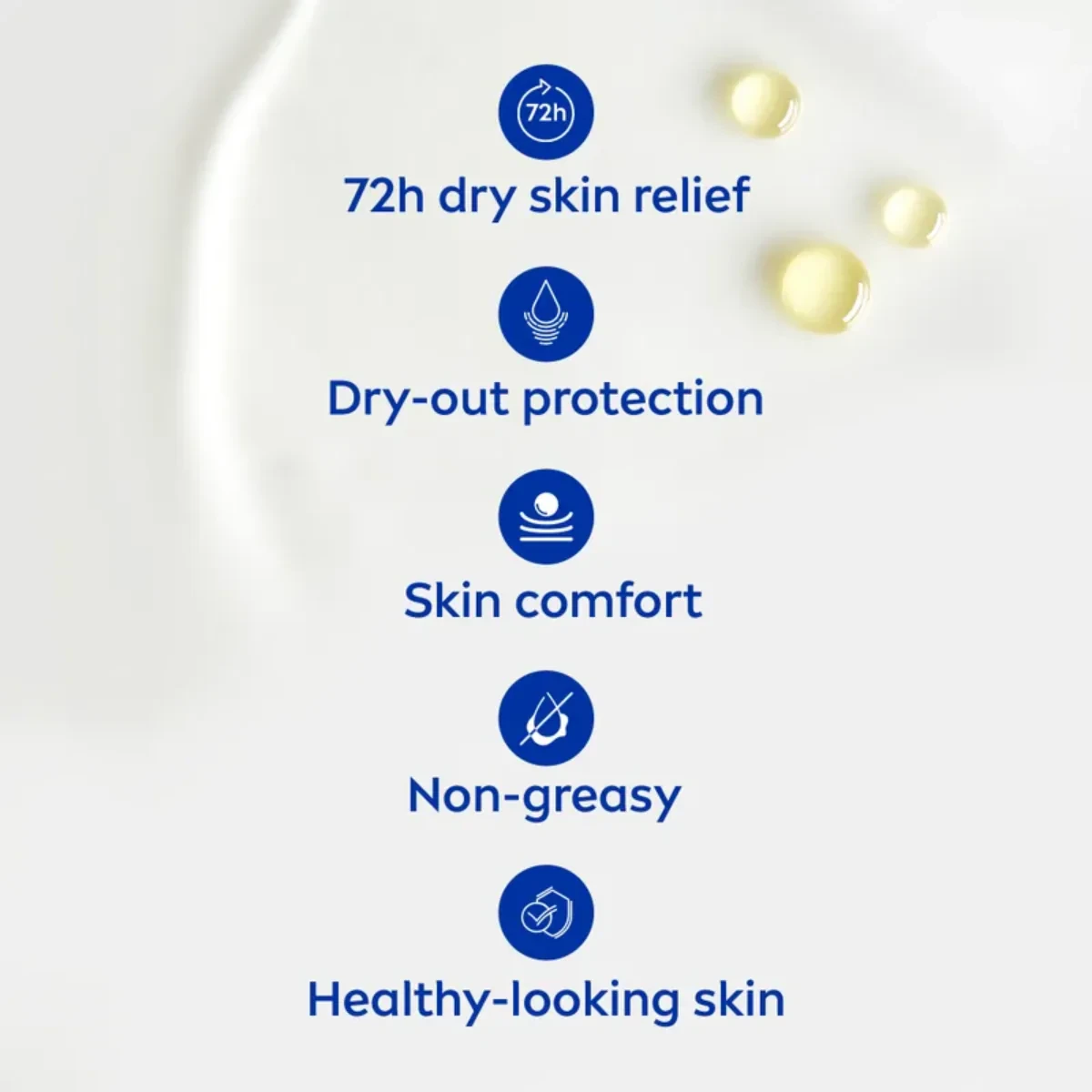 Nivea Repair & Care Body Lotion provides 72-hour relief for very dry skin. Enriched with deep moisture serum and dexpanthenol, it strengthens the skin barrier and supports hydration. Ideal for daily use, it absorbs quickly and leaves skin feeling smooth and comfortable. Key Features