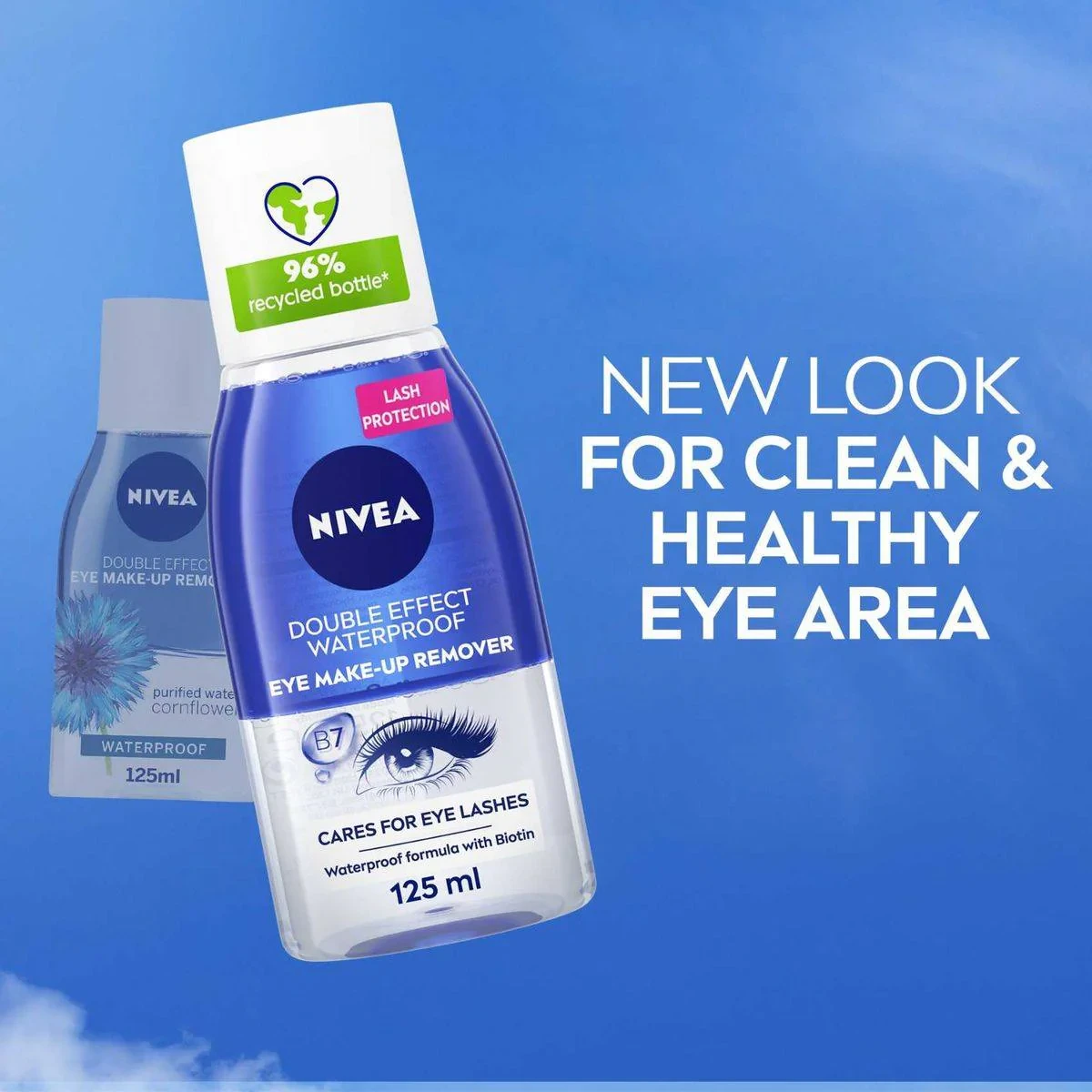 Nivea Eye Makeup Remover Double Effect 125ml is designed to remove waterproof and long-lasting makeup effortlessly. Its bi-phase formula with Biotin cares for eyelashes and eyebrows, leaving the eye area clean and healthy. Suitable for all skin types, including sensitive skin. Key Features Effective in removing waterproof mascara Non-irritating and gentle on eyes Non-oily, silky texture Bi-phase formula with Biotin Water/Aqua/Eau, Phenoxyethanol, Dimethicone, Sodium Chloride, Benzethonium Chloride, Caprylyl/Capryl Glucoside, Centaurea Cyanus Flower Extract, Helianthus Annuus Seed Oil, Isododecane, Isopropyl Palmitate, Trisodium Edta.Nivea: Trusted skincare brand known for gentle, effective products.Shake Well Before Use. Apply To A Cotton Pad And Swipe Gently.For external use only. If irritation occurs, discontinue use. Avoid getting into eyes.