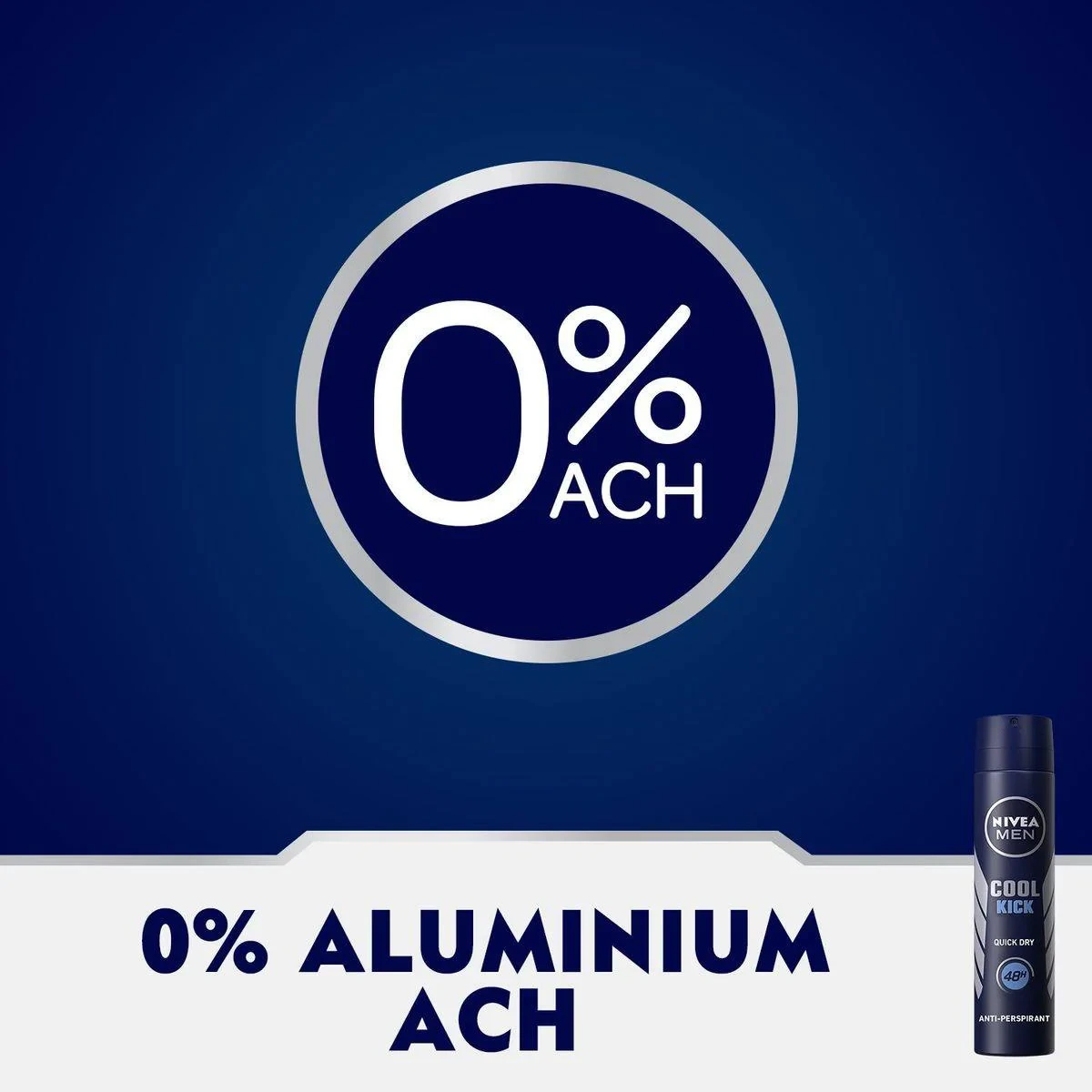 Nivea Men Deodorant Spray Cool Kick offers 48-hour protection with a refreshing scent. Its quick-dry formula ensures comfort and confidence all day long. Key Features 0% Aluminium ACH Quick dry formula 48-hour protection Long-lasting freshness Active Ingredient (Antiperspirant): Aluminum Chlorohydrate. Key Ingredients: Propellants, Alcohol Denat., Aluminum Chlorohydrate, Menthol, Fragrance.Nivea: Trusted skincare brand offering a range of products for men and women, known for quality and innovation.Shake Well Before Use. Hold Can 15Cm From The Underarm And Spray. Allow Product To Dry Completely.Aerosol Warnings: Extremely Flammable. Pressurized container. Do not apply to irritated or damaged skin.