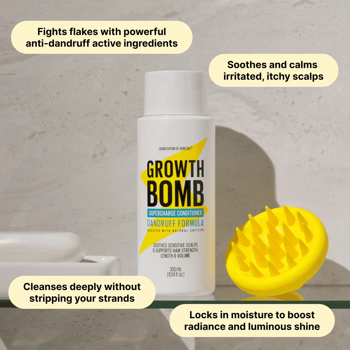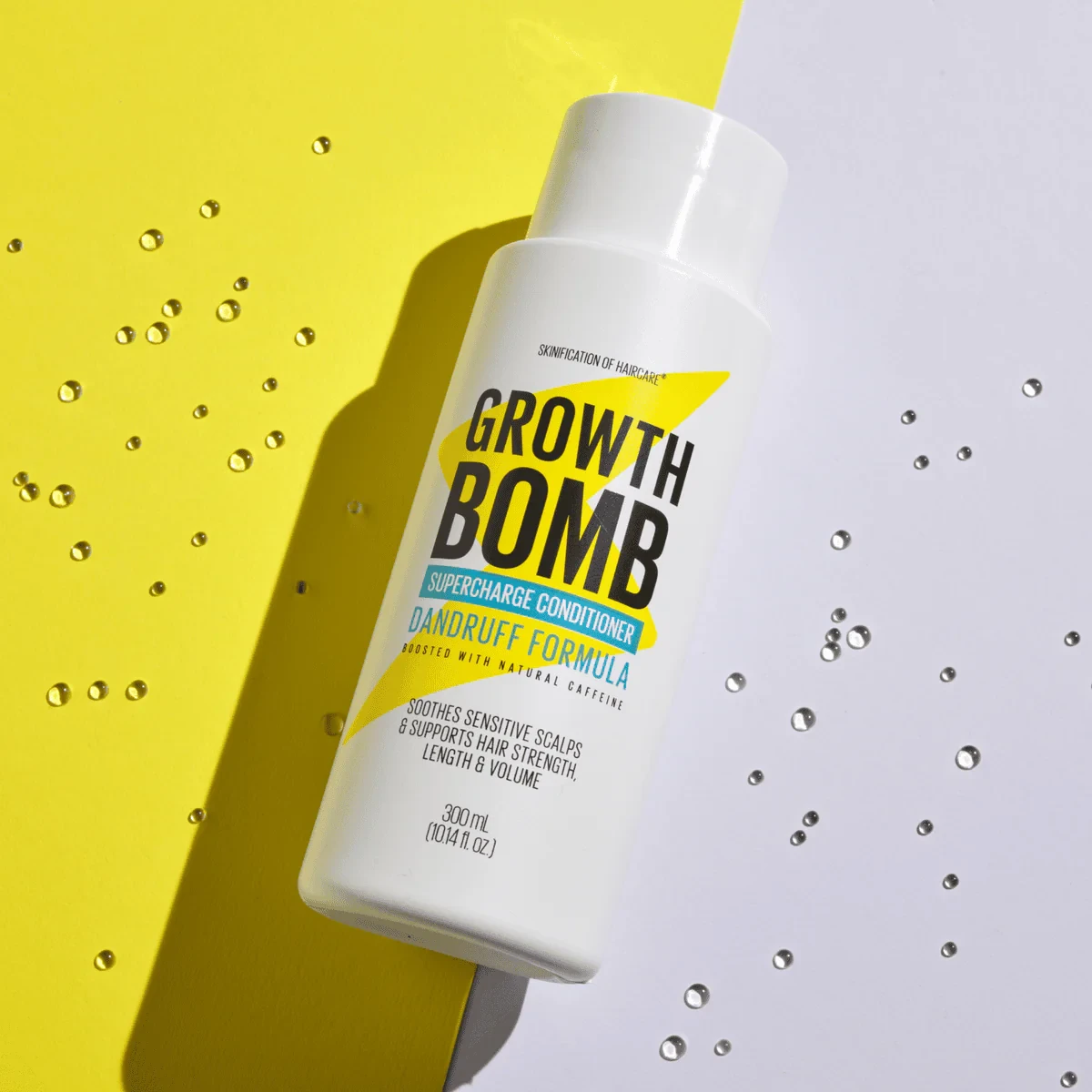 Growth Bomb Dandruff Conditioner is packed with natural caffeine and botanical extracts to soothe sensitive scalps and fight flakes. It hydrates and nourishes the scalp, supporting stronger, longer, fuller looking hair. Key Features