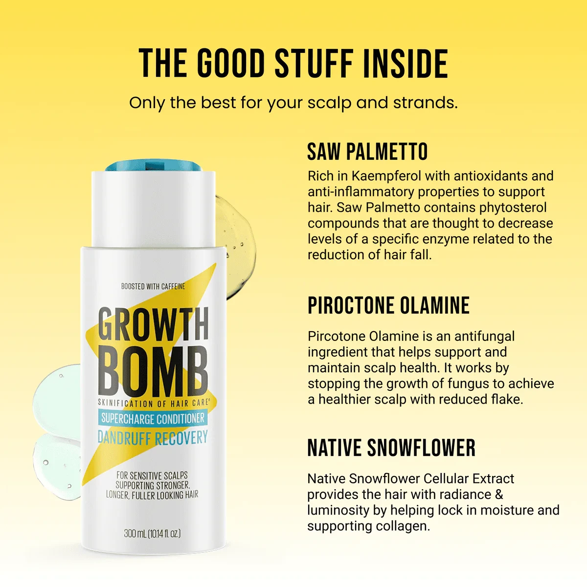 Water, Stearyl Alcohol, Behentrimonium Chloride, Cetyl Alcohol, Octyldodecyl Myristate, Isopropyl Alcohol, Glycerin, Hydrolyzed Corn Starch, Fragrance, Hydroxyethylcellulose, Piroctone Olamine, Sodium Benzoate, Potassium Sorbate, Disodium Edta, Melaleuca Alternifolia (Tea Tree) Leaf Extract, Serenoa Serrulata Fruit Extract, Ilex Paraguariensis Leaf Extract, Citric Acid.Growth Bomb: Energizing hair care with natural caffeine for stronger, longer hair.Massage evenly into wet hair from root to tip after cleansing with Growth Bomb Dandruff Shampoo. Leave for 2-3 minutes before rinsing thoroughly.If the product enters the eye, wash out thoroughly with plenty of clean water.