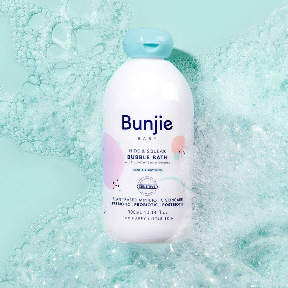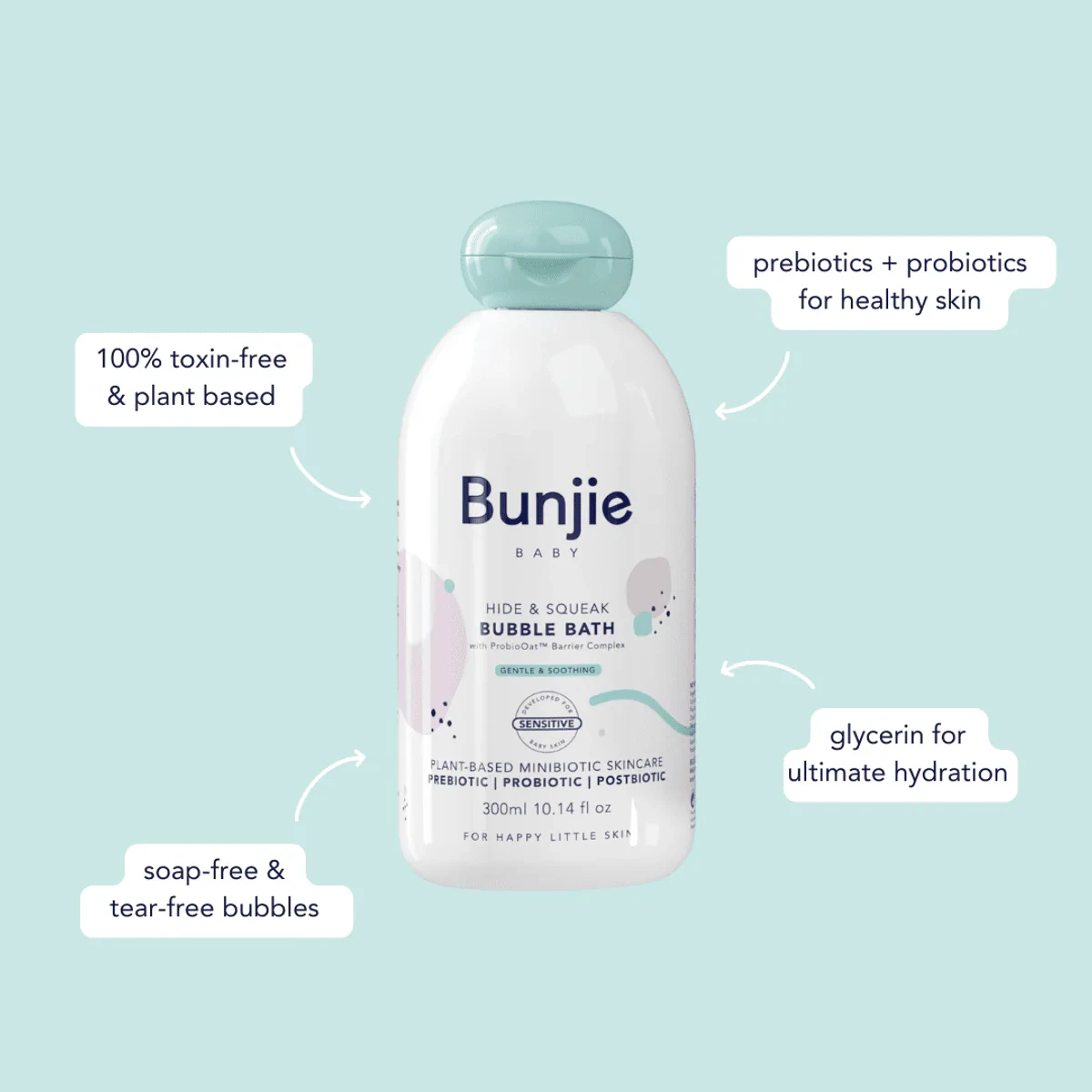 Bunjie Bubble Bath 300ml is a gentle, soothing bubble bath designed for sensitive baby skin. Formulated with ProbioOat Barrier Complex, it offers plant-based mini biotic skincare with prebiotics, probiotics, and postbiotics. Soap-free and tear-free, it ensures ultimate hydration with glycerin for happy little skin. Key Features 100% toxin-free & plant-based Gentle & soothing Soap-free & tear-free bubbles Prebiotics + probiotics for healthy skin Suitable for sensitive skin Key Ingredients: Aqua, Cocamidopropyl Betaine, Coco-Glucoside, Glycerin, Colloidal Oatmeal, Avena Sativa (Oat) Kernel Oil, Moringa Seed Oil, Prebiotics (Lactobacillus, Alpha-glucan Oligosaccharide). Note: Soap-free, made with purified water.Innovative baby skincare brand specializing in plant-based, toxin-free products.Add 1 big squirt or 2?3 squirts of wash under warm running bath water to create gentle bubbles. Always supervise children during bath time.Soap-free & tear-free bubbles.