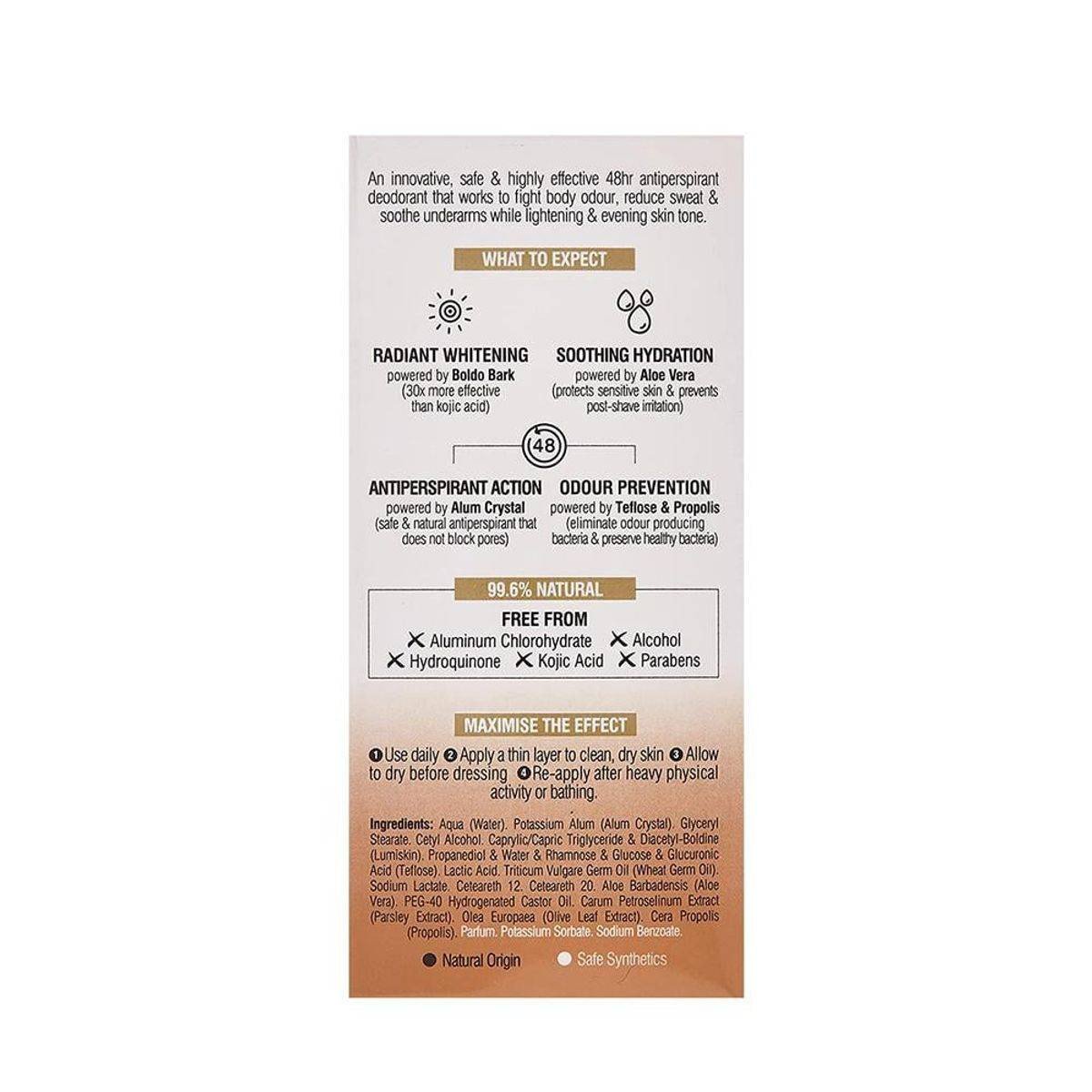 This innovative deodorant offers 48-hour protection, fights body odor, reduces sweat, and soothes underarms while lightening and evening skin tone. Ideal for sensitive skin. Key Features