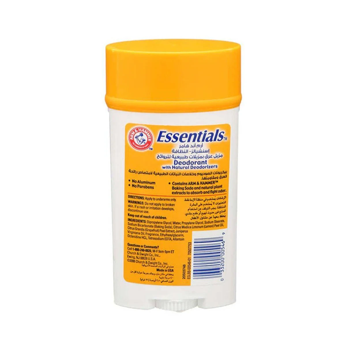 Arm & Hammer Deodorant Stick Essential Clean Juniper Berry offers natural deodorizing with baking soda and plant extracts. Free from aluminum, parabens, and phthalates, it provides 24-hour odor protection. Key Features 24h odor protection Free of aluminum, parabens & phthalates Contains natural deodorizers Includes ARM & HAMMER baking soda Moisturizers for skin care Dipropylene Glycol, Water, Propylene Glycol, Sodium Stearate, Sodium Bicarbonate (Baking Soda), Citrus Medica Limonum (Lemon) Peel Oil, Citrus Grandis (Grapefruit) Peel Extract, Juniperus Virginiana Oil, Fragrance, Ethylhexylglycerin, Octenidine HCL, Tetrasodium EDTA, Allantoin.Arm & Hammer: Trusted for effective odor protection with natural ingredients.Apply to underarms only.Do not apply to broken skin. If a rash or irritation develops, discontinue use. Keep out of reach of children.