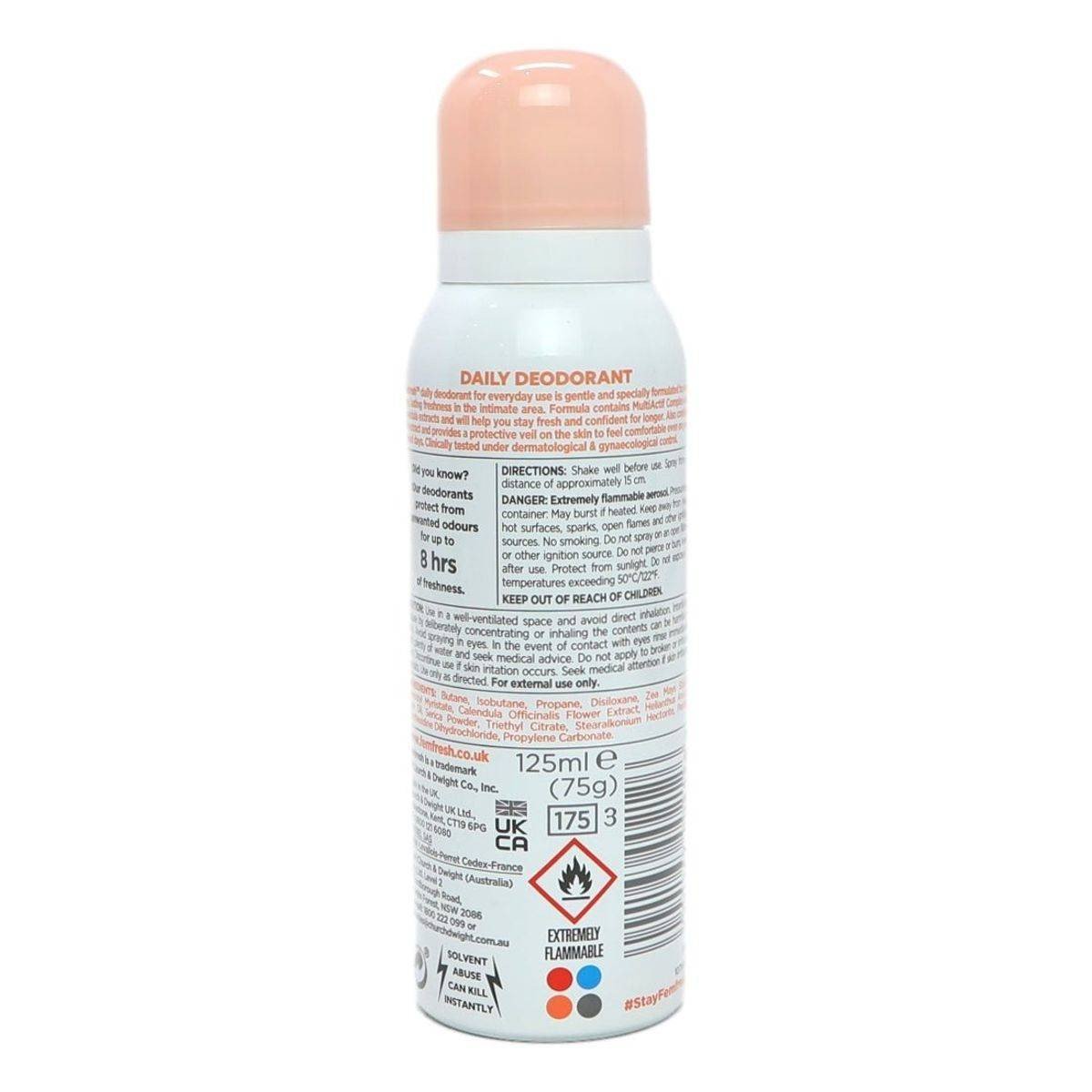 Butane, Isobutane, Propane, Disiloxane, Zea Mays Starch, Isopropyl Myristate, Calendula Officinalis Flower Extract, Helianthus Annuus Seed Oil, Serica Powder, Triethyl Citrate, Stearalkonium Hectorite, Parfum, Chlorhexidine Dihydrochloride, Propylene Carbonate, Tocopherol.Femfresh is a trusted brand in women's intimate care, offering pH-balanced, gentle products for freshness and hygiene.Shake well before use. Spray from a distance of approximately 15cm. For external use only.Extremely flammable aerosol. Pressurized container: May burst if heated. Keep away from heat, hot surfaces, sparks, open flames and other ignition sources. No smoking. Do not spray on an open flame or other ignition source. Do not pierce or burn, even after use. Protect from sunlight. Do not expose to temperatures exceeding 50°C/122°F. Keep out of reach of children. Use in a well-ventilated space and avoid direct inhalation. Intentional misuse by deliberately concentrating and inhaling the contents can be harmful or fatal. Avoid spraying in eyes. In the event of contact with eyes, rinse immediately with plenty of water and seek medical advice. Do not apply to broken or irritated skin. Use only as directed. For external use only.