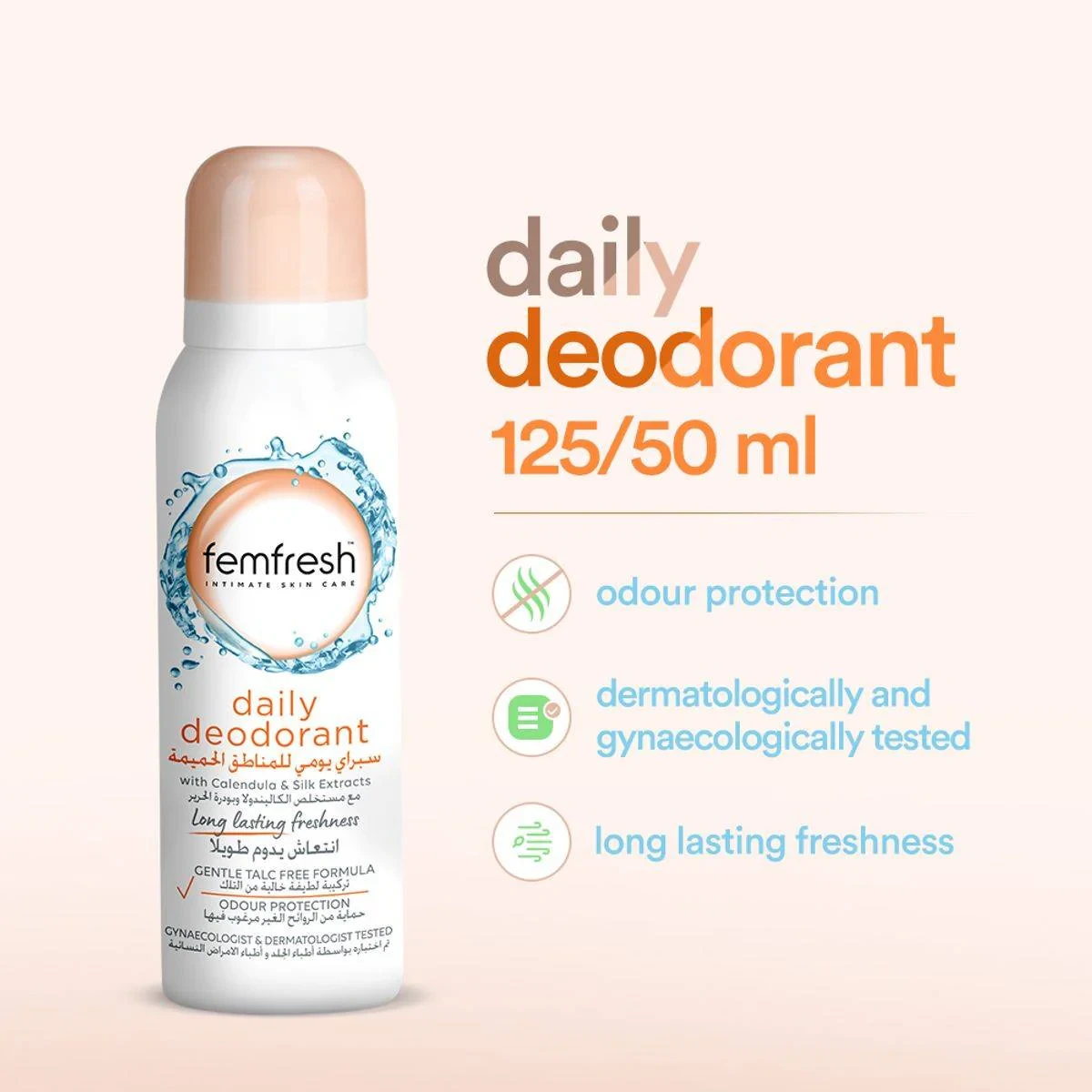 Femfresh Intimate Freshness Deodorant is a gentle, pH-balanced spray designed for daily use. It contains calendula and silk extracts for long-lasting freshness and odour protection. Dermatologically and gynecologically tested, it is safe for sensitive skin. Key Features