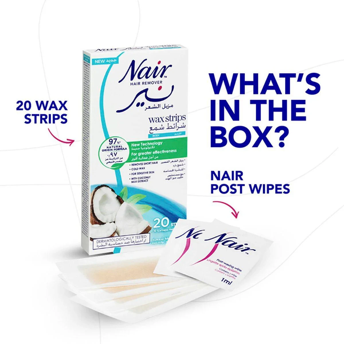 Nair Body Wax Strips Coconut 20 Pack offers a convenient hair removal solution with 97% natural origin formula. Ideal for sensitive skin, it includes coconut milk extract for a soothing experience. Dermatologically tested for safety and effectiveness. Key Features Removes short hair Cold wax for sensitive skin Contains coconut milk extract Dermatologically tested 97% natural origin formula Long-lasting results for up to 4 weeks 97% Natural Origin Formula, Coconut Milk Extract.Nair: Experts in hair removal solutions with natural ingredients for sensitive skin.Peel, Apply, Pull, Wipe & MoisturizeWAX WARNING: Always perform a patch test before use. Do not use on broken, irritated, or sunburnt skin. Wait 24 hours before applying deodorant/perfume. Keep out of reach of children.